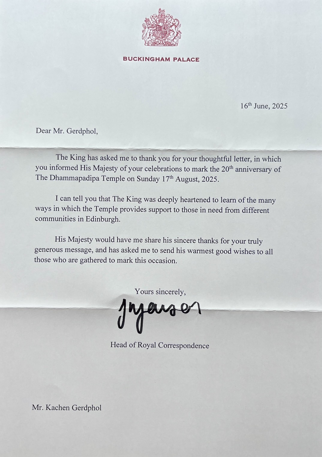 พระบาทสมเด็จพระเจ้าอยู่หัว ทรงพระกรุณาโปรดเกล้าฯ ให้ข้าพเจ้าส่งข้อความพระราชสาส์นแสดงความขอบคุณ สำหรับจดหมายที่ได้แจ้งให้พระองค์ฯ ทรงทราบเกี่ยวกับการเฉลิมฉลองครบรอบ 20 ปี ของสมาคมวัดธรรมปทีป ในวันอาทิตย์ที่ 17 สิงหาคม 2568