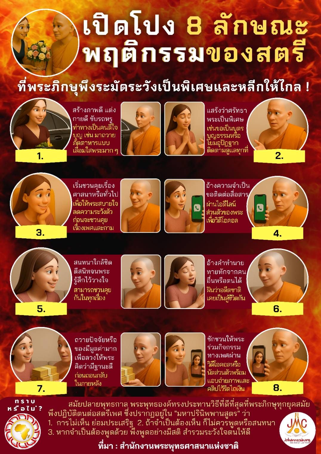 สำนักงานพระพุทธศาสนาแห่งชาติ ได้มีคำแนะให้พระภิกษุสังเกต 8 พฤติกรรมสตรี ที่พระภิกษุพึงระมัดระวังเป้นพิเศษ คือ
