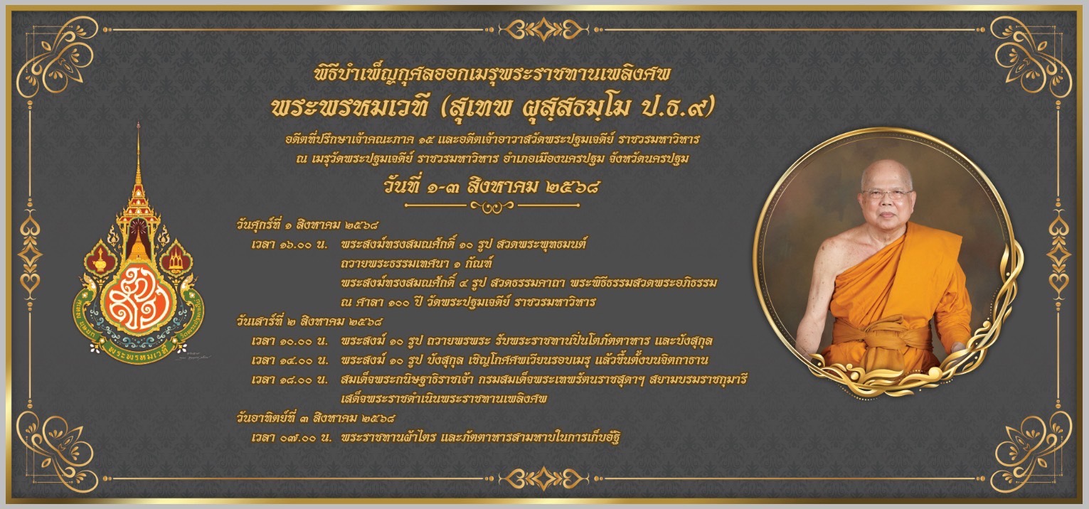 “พระพรหมเวที มีนามเดิมว่า สุเทพ บุษบก เกิดเมื่อวันที่ 30 กรกฎาคม พ.ศ. 2484 ที่ ตำบลบ้านปราโมทย์ อำเภอบางคนที จังหวัดสมุทรสงคราม ท่านอุปสมบท เมื่อวันที่ 24 มิถุนายน พ.ศ. 2504 ณ วัดปราโมทย์ อำเภอบางคนที จังหวัดสมุทรสงคราม โดยมีพระวิกรมมุนี (ผล อุปติสฺโส) เจ้าคณะจังหวัดสุพรรณบุรี วัดปราสาททอง เป็นพระอุปัชฌาย์ พระอาจารย์เล้ง ปทีโป วัดปราโมทย์ เป็นพระกรรมวาจาจารย์ พระครูสมุห์วรินทร์ วัดปราโมทย์ เป็นพระอนุสาวนาจารย์ ได้รับนามฉายาว่า “ผุสฺสธมฺโม” ท่านเรียนเก่งสอบบาลีประโยค 9 ได้เมื่อปี 2525 ร่วมพัฒนาวัดและสนองกิจการงานคณะสงฆ์ จนได้รับไว้วางใจจากเจ้าคณะปกครอง ให้ดำรตงตำแหน่งเจ้าอาวาสพระปฐมเจดีย์เมื่อปี 2536 เป็นเจ้าคณะภาค 15 สมณศักดิ์ท่านหลังสุดเป็น พระพรหมเวที ซึ่งในวันที่ 2 สิงหาคม 2568 ที่จะถึงนี้ จะมีงานพระราชทานเพลิงศพของท่าน สมเด็จพระกนิษฐาธิราชเจ้ากรมสมเด็จพระเทพรัตนราชสุดา ฯ สยามบรมราชกุมารี เสด็จพระราชดำเนินมาถวายพระเพลิง จึงขอเชิญชวนคณะศิษยานุศิษย์ของท่านมา ส่งท่านเป็นครั้งสุดท้ายในวันดังกล่าวด้วย.. “