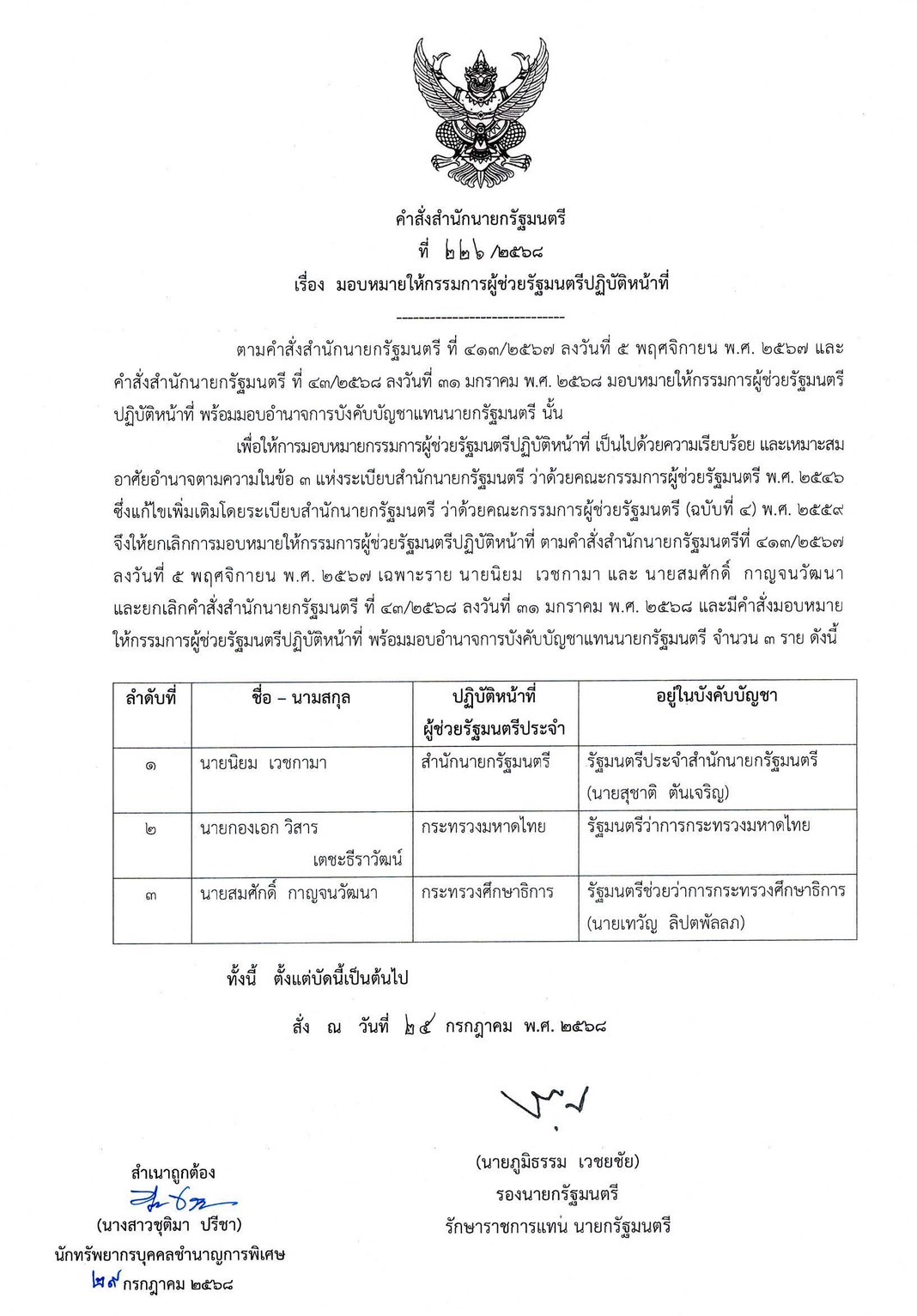 วันที่ 29 กรกฎาคม 2568 สำนักนายกรัฐมนตรีได้ออกคำสั่งที่ 226/2568 ลงวันที่ 25 กรกฎาคม 2568 เรื่องมอบหมายให้กรรมการผู้ช่วยรัฐมนตรีปฏิบัติหน้าที่ โดยมีเนื้อหาสำคัญเกี่ยวกับการปรับเปลี่ยนและแต่งตั้งกรรมการผู้ช่วยรัฐมนตรีใหม่ เพื่อให้การบริหารราชการแผ่นดินเป็นไปด้วยความเรียบร้อยและเหมาะสม โดยอาศัยอำนาจตามข้อ 3 แห่งระเบียบสำนักนายกรัฐมนตรีว่าด้วยคณะกรรมการผู้ช่วยรัฐมนตรี พ.ศ. 2546 และที่แก้ไขเพิ่มเติม คำสั่งฉบับนี้ได้ยกเลิกการมอบหมายให้กรรมการผู้ช่วยรัฐมนตรีปฏิบัติหน้าที่ตามคำสั่งสำนักนายกรัฐมนตรีที่ 413/2567 ลงวันที่ 5 พฤศจิกายน 2567 เฉพาะรายของนายนิยม เวชกามา และนายสมศักดิ์ กาญจนวัฒนา รวมถึงยกเลิกคำสั่งสำนักนายกรัฐมนตรีที่ 43/2568 ลงวันที่ 31 มกราคม 2568 พร้อมกันนี้ได้มีการแต่งตั้งและมอบหมายให้กรรมการผู้ช่วยรัฐมนตรีปฏิบัติหน้าที่ จำนวน 3 ราย ได้แก่