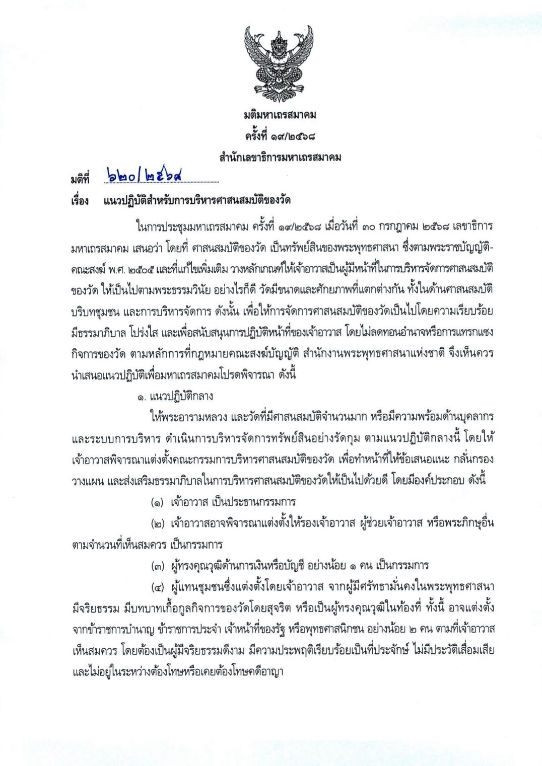 ล่าสุดวันนี้มีการประกาศมติมหาเถรสมาคมดัง กล่าว โดยมีความว่าในการประชุมมหาเถรสมาคม ครั้งที่ ๑๙/๒๕๖๘ เมื่อวันที่ ๓๐ กรกฎาคม ๒๕๖๘ เลขาธิการมหาเถรสมาคม เสนอว่า โดยที่ ศาสนสมบัติของวัด เป็นทรัพย์สินของพระพุทธศาสนา ซึ่งตามพระราชบัญญัติคณะสงฆ์ พ.ศ. ๒๕๐๕ และที่แก้ไขเพิ่มเติม วางหลักเกณฑ์ให้เจ้าอาวาสเป็นผู้มีหน้าที่ในการบริหารจัดการศาสนสมบัติของวัด ให้เป็นไปตามพระธรรมวินัย อย่างไรก็ดี วัดมีขนาดและศักยภาพที่แตกต่างกัน ทั้งในด้านศาสนสมบัติ บริบทชุมชน และการบริหารจัดการ ดังนั้น เพื่อให้การจัดการศาสนสมบัติของวัดเป็นไปโดยความเรียบร้อย มีธรรมาภิบาล โปร่งใส และเพื่อสนับสนุนการปฏิบัติหน้าที่ของเจ้าอาวาส โดยไม่ลดทอนอำนาจหรือการแทรกแซงกิจการของวัด ตามหลักการที่กฎหมายคณะสงฆ์บัญญัติ สำนักงานพระพุทธศาสนาแห่งชาติ จึงเห็นควรนำเสนอแนวปฏิบัติเพื่อมหาเถรสมาคมโปรดพิจารณา ดังนี้