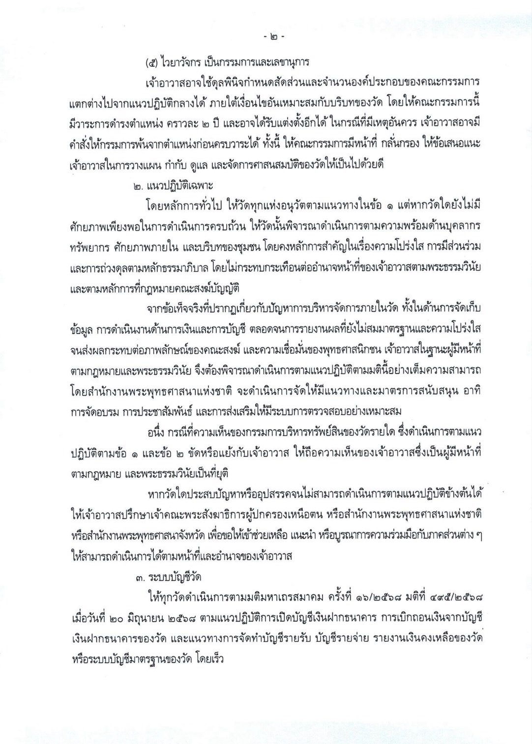 ให้ทุกวัดดำเนินการตามมติมหาเถรสมาคม ครั้งที่ ๑๖/๒๕๖๘ มติที่ ๔๙๕/๒๕๖๘ เมื่อวันที่ ๒๐ มิถุนายน ๒๕๖๘ ตามแนวปฏิบัติการเปิดบัญชีเงินฝากธนาคาร การเบิกถอนเงินจากบัญชีเงินฝากธนาคารของวัด และแนวทางการจัดทำบัญชีรายรับ บัญชีรายจ่าย รายงานเงินคงเหลือของวัดหรือระบบบัญชีมาตรฐานของวัด โดยเร็ว