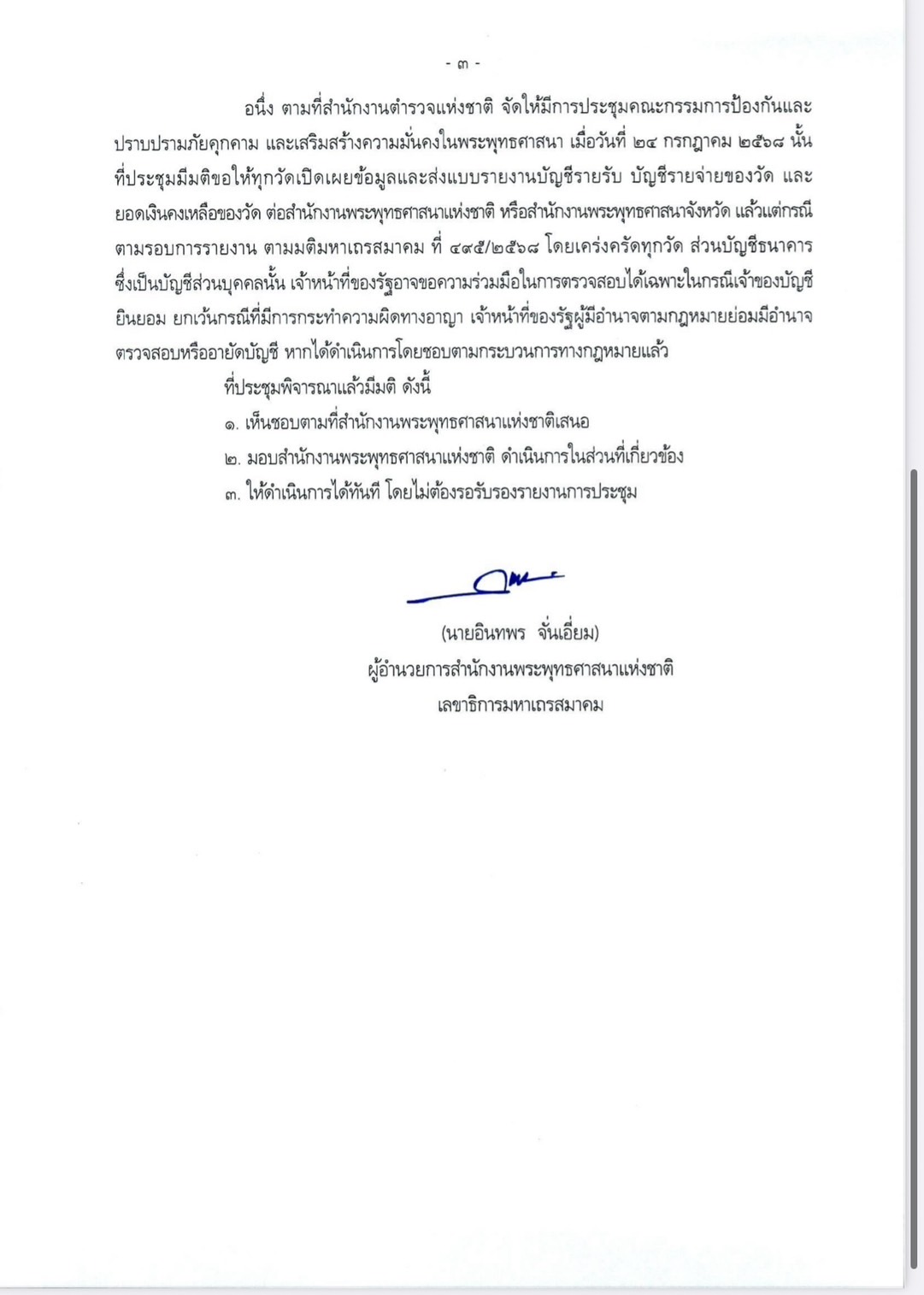 อนึ่ง ตามที่สำนักงานตำรวจแห่งชาติ จัดให้มีการประชุมคณะกรรมการป้องกันและปราบปรามภัยคุกคาม และเสริมสร้างความมั่นคงในพระพุทธศาสนา เมื่อวันที่ ๒๔ กรกฎาคม ๒๕๖๘ นั้น ที่ประชุมมีมติขอให้ทุกวัดเปิดเผยข้อมูลและส่งแบบรายงานบัญชีรายรับ บัญชีรายจ่ายของวัด และยอดเงินคงเหลือของวัด ต่อสำนักงานพระพุทธศาสนาแห่งชาติ หรือสำนักงานพระพุทธศาสนาจังหวัด แล้วแต่กรณีตามรอบการรายงาน ตามมติมหาเถรสมาคม ที่ ๔๙๕/๒๕๖๘ โดยเคร่งครัดทุกวัด