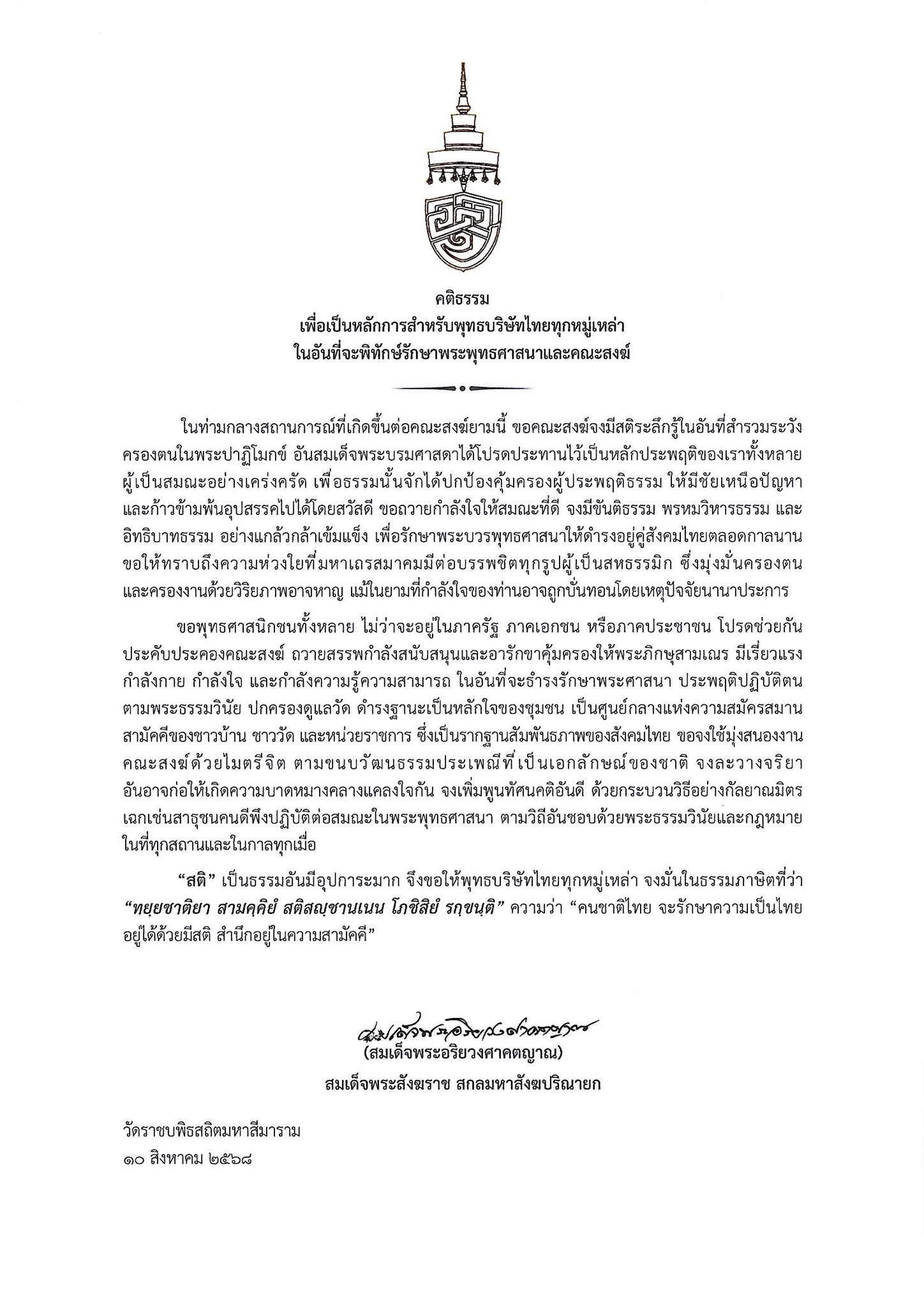 ในท่ามกลางสถานการณ์ที่เกิดขึ้นต่อคณะสงฆ์ยามนี้ ขอคณะสงฆ์จงมีสติระลึกรู้ในอันที่สำรวมระวัง ครองตนในพระปาฏิโมกข์ อันสมเด็จพระบรมศาสดาได้โปรดประทานไว้เป็นหลักประพฤติของเราทั้งหลายผู้เป็นสมณะอย่างเคร่งครัด เพื่อธรรมนั้นจักได้ปกป้องคุ้มครองผู้ประพฤติธรรม ให้มีชัยเหนือปัญหา และก้าวข้ามพ้นอุปสรรคไปได้โดยสวัสดี ขอถวายกำลังใจให้สมณะที่ดี จงมีขันติธรรม พรหมวิหารธรรม และอิทธิบาทธรรม อย่างแกล้วกล้าเข้มแข็ง เพื่อรักษาพระบวรพุทธศาสนาให้ดำรงอยู่คู่สังคมไทยตลอดกาลนาน ขอให้ทราบถึงความห่วงใยที่มหาเถรสมาคมมีต่อบรรพชิตทุกรูปผู้เป็นสหธรรมิก ซึ่งมุ่งมั่นครองตน และครองงานด้วยวิริยภาพอาจหาญ แม้ในยามที่กำลังใจของท่านอาจถูกบั่นทอนโดยเหตุปัจจัยนานาประการ