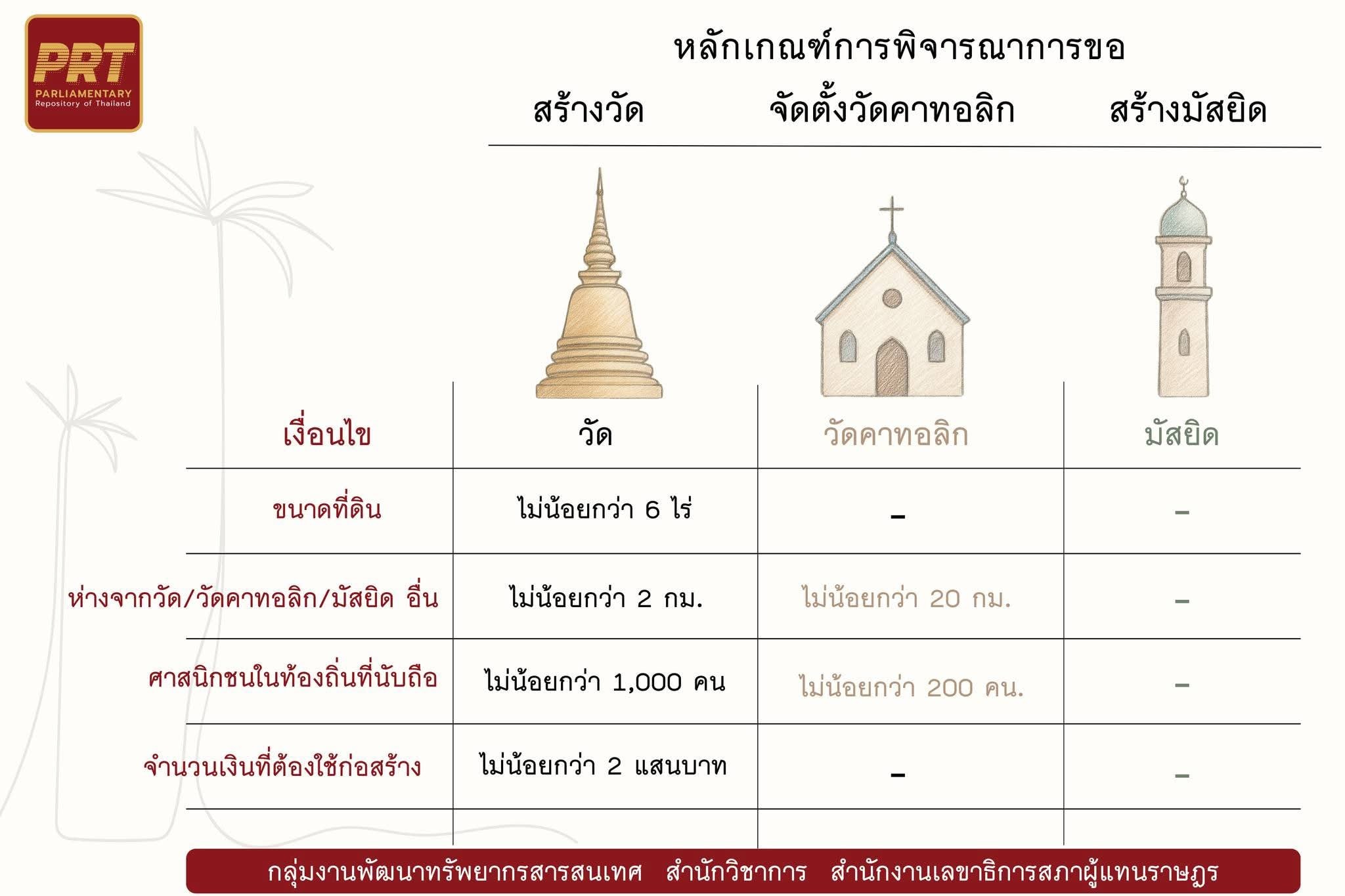 วันที่ 22 สิงหาคม 2568 มีการแชร์รายงานการพิจารณาศึกษาคณะกรรมาธิการการศาสนา คุณธรรม จริยธรรม คิลปะและวัฒนธรรม วุฒิสภา เรื่อง การจัดตั้งและการแก้ไขปัญหาศาสนสถานว่าด้วย วัด -มัสยิด -วัดคาทอลิก โดยมีเงื่อนไขแตกต่างกัน ดังนี้