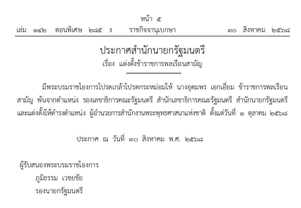 วันที่ 30 สิงหาคม 2568 ราชกิจจานุเบกษา ประกาศสำนักนายกรัฐมนตรี เรื่องการแต่งตั้งข้าราชการพลเรือนสามัญ ความว่า มีพระบรมราชโองการโปรดเกล้าโปรดกระหม่อมให้ นางอุดมพร เอกเอี่ยม ข้าราชการสามัญ พ้นจากตำแหน่ง รองเลขาธิการคณะรัฐมนตรี สำนักเลขาธิการคณะรัฐมนตรี สำนักนายกรัฐมนตรี และแต่งตั้งให้ดำรงตำแหน่ง ผู้อำนวยการสำนักงานพระพุทธศาสนาแห่งชาติ ตั้งแต่วันที่ 1 ตุลาคม 2568