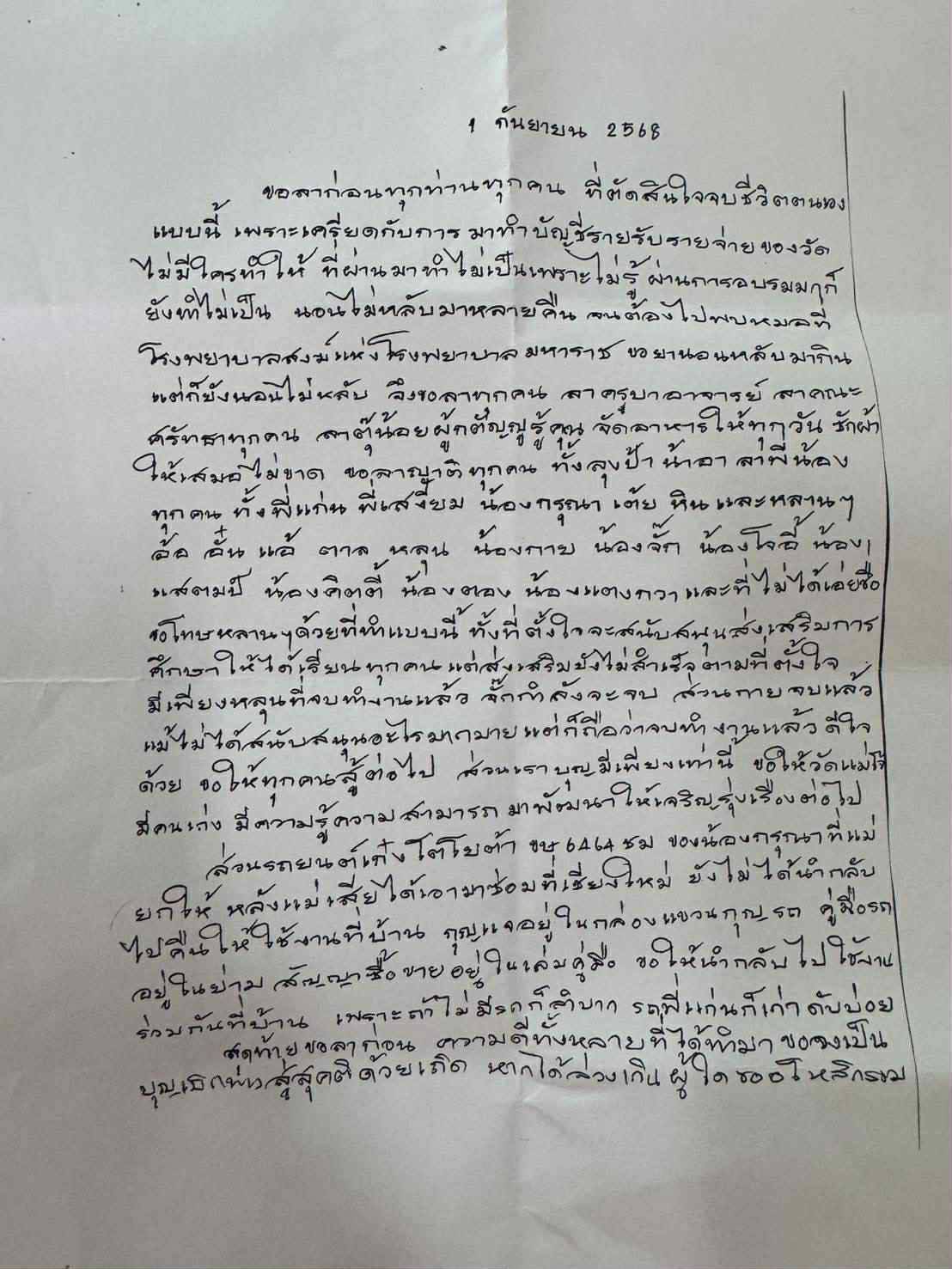 ขอลาก่อนทุกท่านทุกคน ที่ตัดสินใจจบชีวิตตนเองแบบนี้ เพราะเครียดกับการทำบัญชีรายรับรายจ่ายของวัด ไม่มีใครทำให้ ที่ผ่านมาทำไม่เป็น เพราะไม่รู้ ผ่านการอบรม ก็ยังทำไม่เป็น นอนไม่หลับหลายคืน จนต้องไปพบหมอที่โรงพยาบาลสงฆ์แห่งโรงพยาบาลมหาราช ขอยานอนหลับมากิน แต่ก็ยังนอนไม่หลับ จึงขอลาทุกคน ลาครูบาอาจารย์ ลาคณะศรัทธาทุกคน ลาตุ๊น้อยผู้กตัญญูรู้คุณ จัดอาหารให้ทุกวัน ซักผ้าให้เสมอไม่ขาด ลาญาติทุกคน ทั้งลุงป้า น้าอา ลาพี่น้องทุกคน ทั้งพี่เแก่น พี่เสงี่ยม น้องกรุณา เต้ย หิน และหลาน ๆ อ้อ อั๋น แอ้ ตาล หลุน น้องกาย น้องจั๊ก น้องโจอี้ น้องแสตมป์ น้องคิดตี้ น้องตอง น้องแตงกวา และที่ไม่ได้เอ๋ยชื่อ ขอโทษหลาน ๆ ด้วยที่ทำแบบนี้ ทั้งที่ตั้งใจจะสนับสนุนส่งเสริมการศึกษาให้ได้เรียนทุกคน แต่ส่งเสริมยังไม่สำเร็จตามที่ตั้งใจ มีเพียงหลุนที่จบทำงานแล้ว จั๊กกำลังจะจบ ส่วนกายจบแล้ว แม้ไม่ได้สนับสนุนอะไรมากมาย แต่ก็ถือว่าจบทำงานแล้ว ดีใจด้วย ขอให้ทุกคนสู้ต่อไป