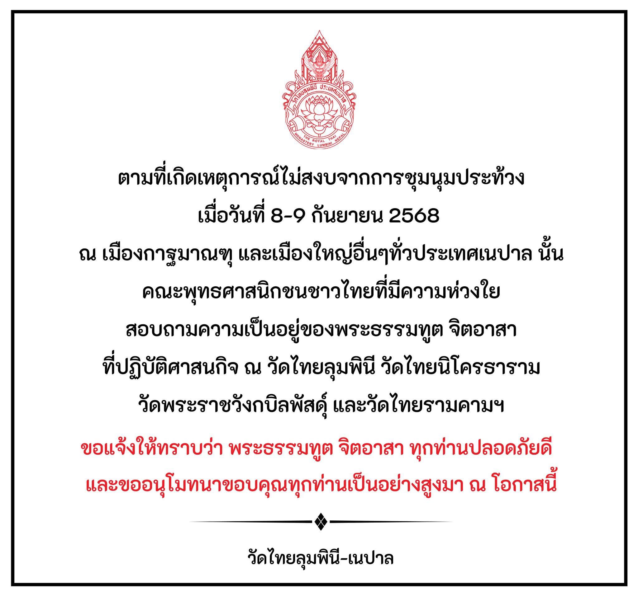 วันที่ 11 กันยายน 2568 วัดไทยลุมพินี ประเทศเนปาล Royal Thai Monastery ได้อัปเดตและแจ้งศาสนิกชนชาวไทยความว่า “ตามที่เกิดเหตุการณ์ไม่สงบจากการชุมนุมประท้วง เมื่อวันที่ 8-9 กันยายน 2568 ณ เมืองกาฐมาณฑุ และเมืองใหญ่อื่นๆ ทั่วประเทศเนปาลนั้น คณะพุทธศาสนิกชนชาวไทยที่มีความห่วงใน สอบถามความเป็นอยู่ของพระธรรมทูต จิตอาสา ที่ปฏิบัติศาสนกิจ ณ วัดไทยลุมพินี วัดไทยนิโครธาราม วัดพระราชวังกบิลพัสดุ์ และวัดไทยรามคามฯ