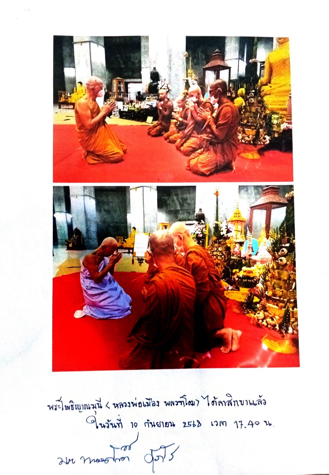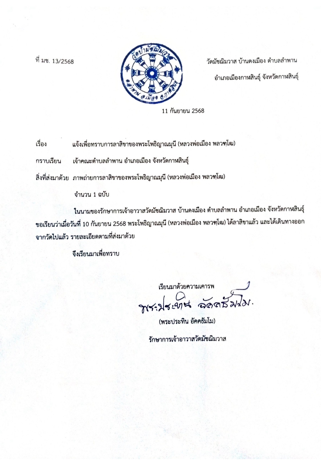 วันที่ 12 กันยายน 2568 เมื่อวันที่ 11 กันยายน ที่ผ่านมา พระประทิน อคฺคธมฺโม รักการเจ้าอาวาสวัดมัชฌมวาส แจ้งเรื่องการลาสิกขาของ “พระโพธิญาณมุนี” หรือ “หลวงพ่อเมือง” แก่เจ้าคณะตำบลลำพวน อ.เมือง จ.กาฬสินธุ์ พร้อมภาพถ่ายเป็นหลักฐาน โดยมีความว่า ในนามของรักษาการเจ้าอาวาสวัดมัชฌิมวาสบ้านดงเมือง ต.ลำพาน อ.เมือง จ.กาฬสินธุ์ ขอเรียนว่าเมื่อวันที่ 10 กันยายน 2568 พระโพธิญาณมุนี (หลวงพ่อเมือง พลวฑฺโฒ) ได้ลาสิกขาแล้ว และได้เดินทางออกจากวัดไปแล้ว