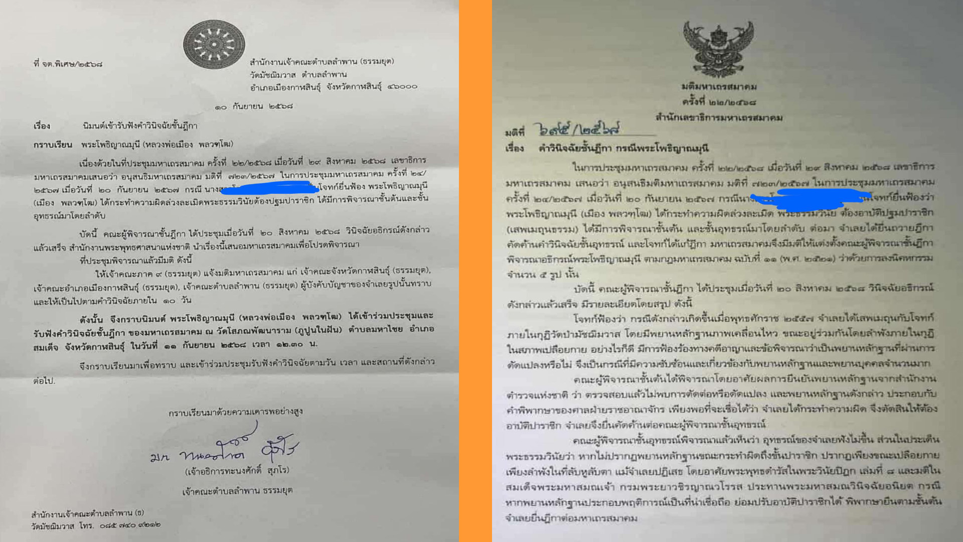 เนื่องด้วยในการประชุมมหาเถรสมาคมเมื่อวันที่ 29 สิงหาคม 2568 เลขาธิการมหาเถรสมาคม เสนอว่า อนุสนธิมหาเถรสมาคมมติที่ 723/2567 ในการประชุมมหาเถรสมาคมคร้ังที่ 24/2567 เมื่อวันที่ 20 สิงหาคม 2567 กรณีนาง………………..โจทย์ยื่นฟ้อง พระโพธิญาณมุนี (เมือง พลวฑฺโฒ) ได้กระทำความผิดล่วงละเมิดพระธรรมวินัยต้องปฐมปาราชิก ได้มีการพิจารณาชั้นตั้น และชั้นอุทธร์มาโดยลำดับ