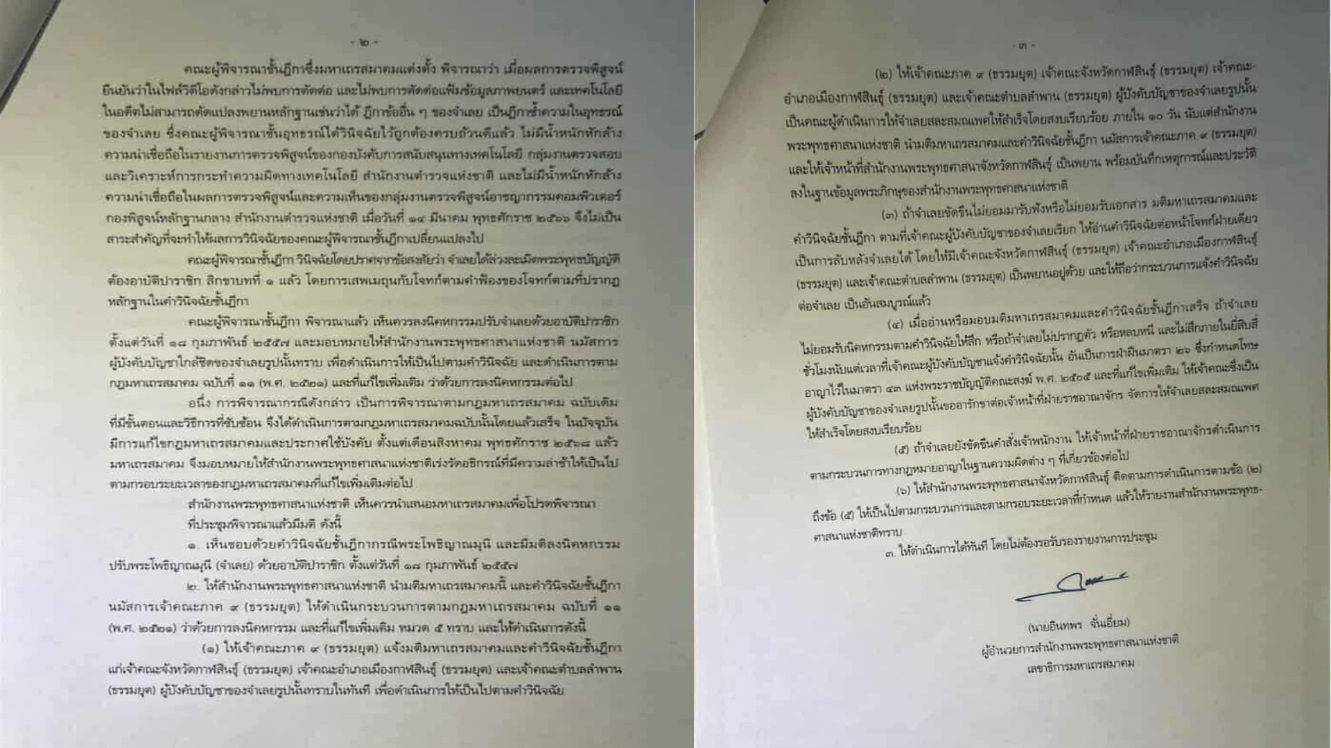 บัดนี้ คณะผู้พิจารณาชั้นฎีกา ได้ประชุมเมื่อวันที่ 20 สิงหาคม 2568 วินิจฉัยอธิกรณ์ดังกล่าวแล้วเสร็จ สำนักงานพระพุทธศาสนาแห่งชาติ นำเรื่องนี้เสนอมหาเถรสมาคมเพื่อโปรดพิจารณา ที่ประชุมพิจารณาแล้วมีมติ ดังนี้