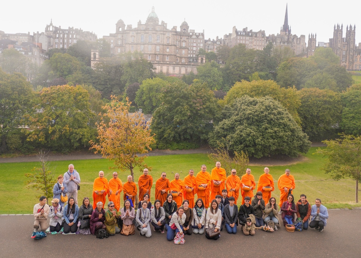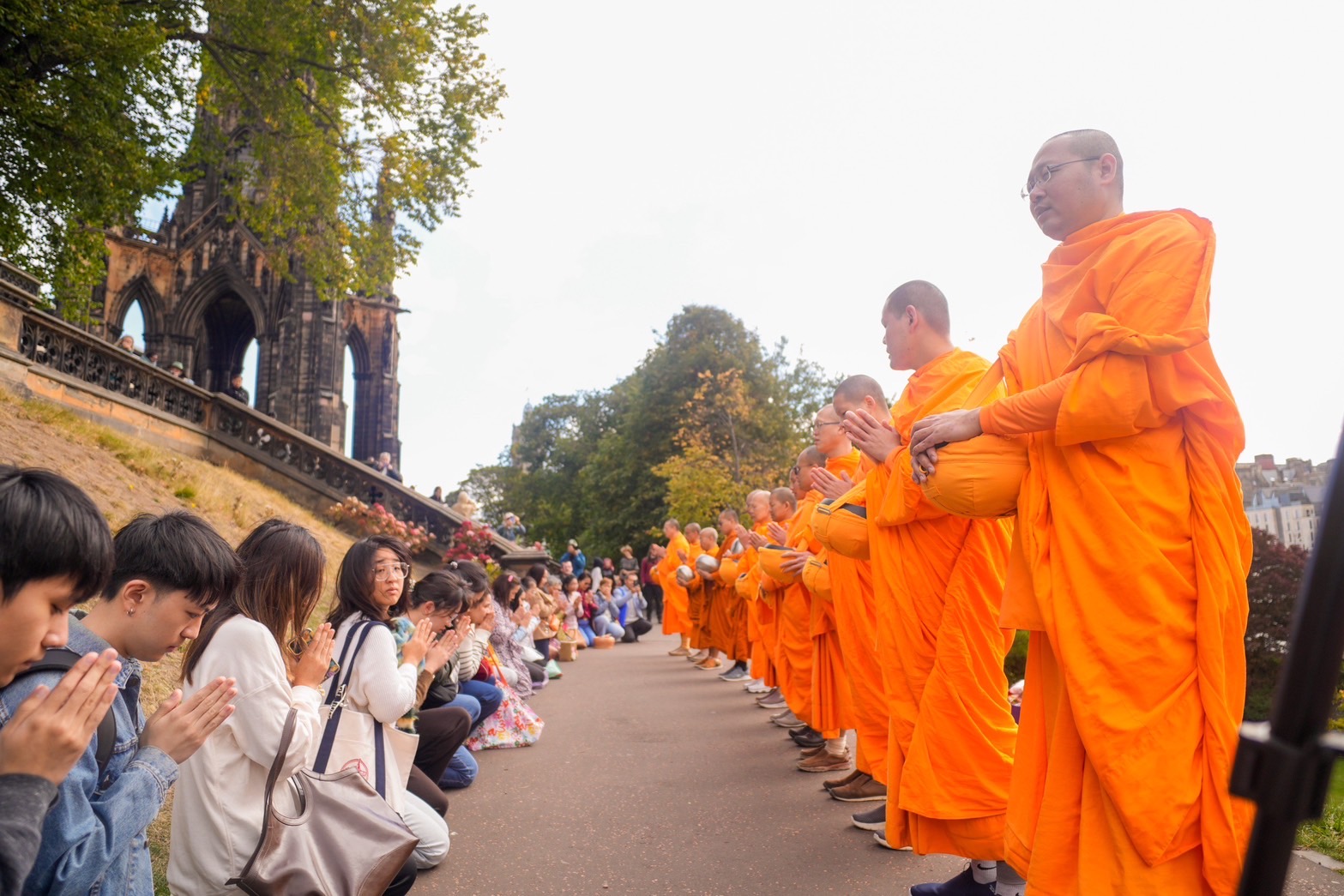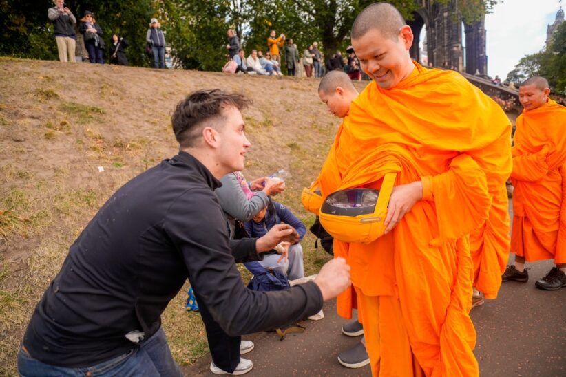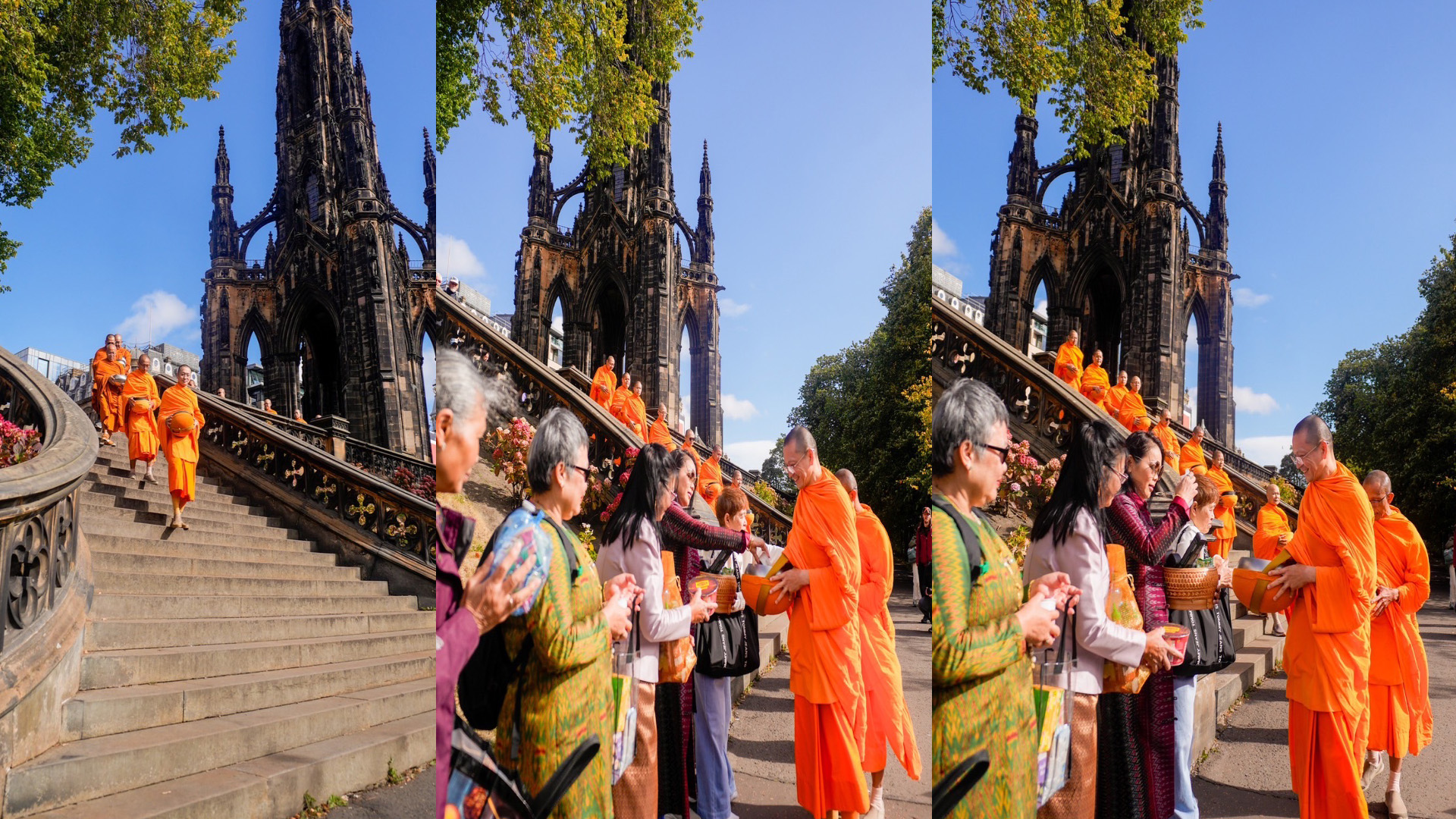 วันที่ 14 กันยายน 2568 เมื่อแสงแดดยามเช้าของนครเอดินเบอระอบอุ่นพอเหมาะ คณะสงฆ์เนื้อนาบุญ จาก 3 วัด ประกอบด้วย วัดธรรมปทีป สกอตแลนด์, วัดพระธรรมกาย นิวคาสเซิล, และวัดพระธรรมกายสกอตแลนด์ จำนวน ๑๓ รูป นำโดย พระครูวิเทศปุญโญภาส เจ้าอาวาสวัดพระธรรมกายนิวคาสเซิล ได้เดินทางมารับบิณฑบาต ณ บริเวณ Scott Monument ใจกลางเมือง ที่เต็มไปด้วยนักท่องเที่ยวและผู้คนจากหลากหลายเชื้อชาติ