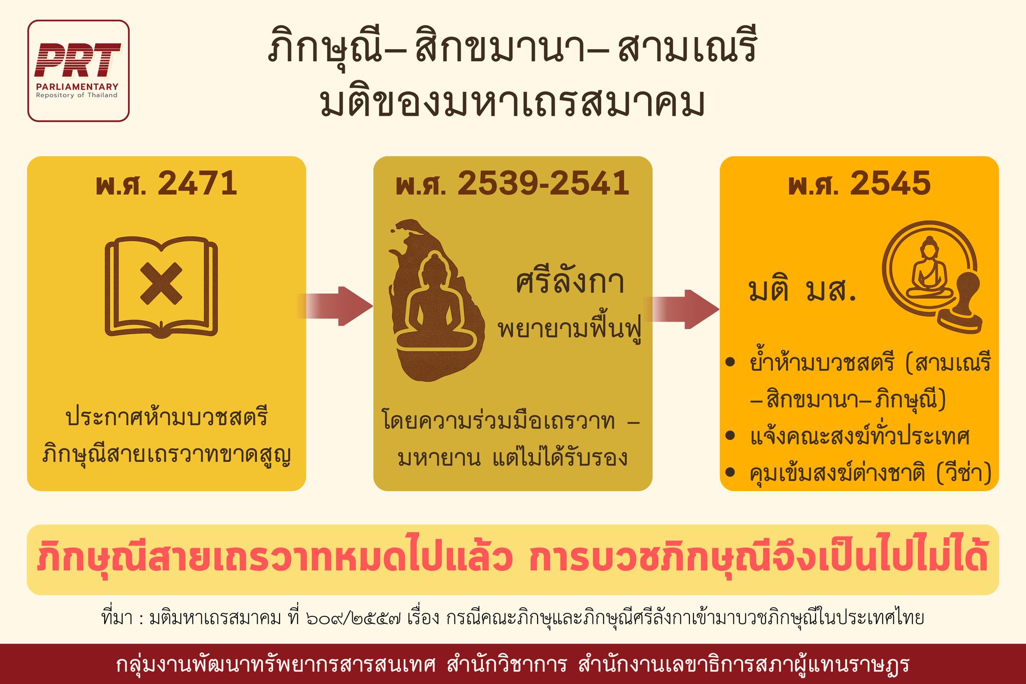 มติ มส. ห้ามบวช “ภิกษุณี” ในประเทศไทย วันที่ 16 กันยายน 2568 เพจ คลังสารสนเทศรัฐสภา ได้เผยแพร่ มติมหาเถรสมาคม ที่ 609/2557 เรื่อง กรณีคณะภิกษุและภิกษุณีศรีลังกาเข้ามาบวชภิกษุณีในประเทศไทย โดยสรุปและย่อเนื้อหา ไว้ดังนี้ 1. มติของมหาเถรสมาคม (พ.ศ. 2545) – ยืนยันห้ามพระภิกษุและสามเณรทุกรูปบวชสตรีเป็น ภิกษุณี–สิกขมานา–สามเณรี – อ้างอิงประกาศเดิม (พ.ศ. 2471) และวินัยปิฎกว่า ภิกษุณีสงฆ์สายเถรวาท ขาดสูญ ทำให้ไม่สามารถบวชภิกษุณีได้ เหตุผลสำคัญ การอุปสมบทภิกษุณีต้องอาศัยภิกษุณีสงฆ์เป็น “ปวัตตินี” และประกอบพิธีคู่กับภิกษุสงฆ์ แต่ภิกษุณีสงฆ์สายเถรวาทหมดไปแล้ว 2. กรณีประเทศศรีลังกา – ภิกษุณีสงฆ์ขาดสูญตั้งแต่ราวพุทธศตวรรษที่ 16 – การฟื้นฟูในสมัยใหม่ (พ.ศ. 2539–2541) เกิดจากความร่วมมือระหว่างสงฆ์เถรวาทและมหายาน (จากเกาหลี–ไต้หวัน) อย่างไรก็ตาม รัฐบาลและมหาเถรศรีลังกา ไม่รับรอง ภิกษุณี เพราะถือว่ามี “ปริสวิบัติ” (ต่างนิกาย) และ “กรรมวาจาวิบัติ” (ใช้ภาษานอกเหนือจากบาลี) 3. มติที่ประชุมเพิ่มเติม 1. ย้ำห้ามบวชสตรีในทุกสถานะ (สามเณรี–สิกขมานา–ภิกษุณี) 2. ให้สำนักงานพระพุทธศาสนาแห่งชาติแจ้งไปยังเจ้าคณะกรุงเทพฯ และเจ้าคณะจังหวัดถือปฏิบัติ 3. ให้ประสานรัฐบาล/กระทรวงการต่างประเทศ ควบคุมการเข้ามาของคณะสงฆ์ต่างชาติที่เกี่ยวข้องกับการบวชสตรี เช่น ไม่ออกวีซ่า หากไม่มีหนังสือรับรองจากคณะสงฆ์ไทย ที่มา : มติมหาเถรสมาคม ที่ 609/2557 เรื่อง กรณีคณะภิกษุและภิกษุณีศรีลังกาเข้ามาบวชภิกษุณีในประเทศไทย จำนวนผู้ชม : 3,490 Leave a ReplyFacebook Comments More Articles By the same author พระธรรมสุธี ผู้รักษาการแทน กทม.มอบตราตั้งให้ พระมหาอดิศักดิ์ อภิปญฺโญ ดำรงตำแหน่ง เจ้าอาวาสวัดบรมสถล (วัดดอน) อุทัย มณี มิ.ย. 18, 2021 วันที่ ๑๘ มิถุนายน ๒๕๖๔ เวลา ๑๖.๐๐ น. ที่อุโบสถวัดบรมสถล(วัดดอน)… ปลัดมหาดไทยยกพุทธชาดก “พระมหาชนก” ปลุกใจชาวราชสีห์และภาคีเครือข่าย สร้างอุดมการณ์ที่แน่วแน่เพื่อ “ความสุขที่ยั่งยืนของพี่น้องประชาชน” อุทัย มณี ก.ค. 19, 2022 วันที่ 19 ก.ค. 65 วานนี้ เวลา 15.00 น. ที่ห้อง War Room ชั้น 2 อาคารศาลาว่าการกระทรวงมหาดไทย… คณะสงฆ์กาญจนบุรี “นำร่อง” ประชุมหมู่บ้านศีล 5 -อ.ป.ต.-วัดประชารัฐ สร้างสุข อุทัย มณี ต.ค. 06, 2023 วันที่ 6 ต.ค. 66 วานนี้ณ วัดตะคร้ำเอน อำเภอท่ามะกา จังหวัดกาญจนบุรี… ด่วน!! มหาเถรมีมติให้ “สมเด็จพระมหาธีราจารย์” ดำรงตำแหน่ง “เจ้าอาวาสวัดพระเชตุพนฯ” อุทัย มณี มี.ค. 30, 2021 วันนี้ (30 มี.ค.64) ณ พระตำหนักเพ็ชร วัดบวรนิเวศวิหาร เขตพระนคร… สมเด็จพระสังฆราช ทรงเททองหล่อพระพุทธรูป และเหรียญ สิงห์หนึ่งสิงห์ดำ อุทัย มณี ก.พ. 18, 2024 สมเด็จพระอริยวงศาค