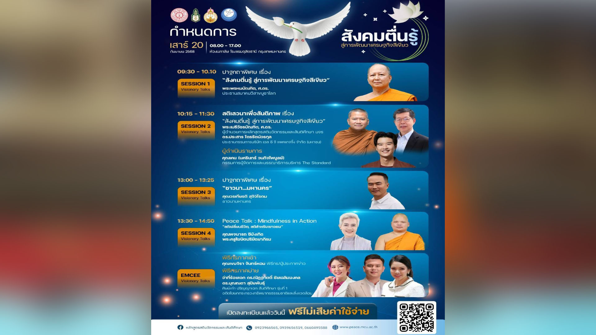 พระเมธีวัชรบัณฑิต หรือ “เจ้าคุณหรรษา” เผยว่าทุกปีหลักสูตรสตินวัตกรรมและสันติศึกษา มหาวิทยาลัยมหาจุฬาลงกรณราชวิทยาลัย (มจร) ทั้งระดับปริญญาโทและปริญญาเอก ศิษย์เก่าและศิษย์ปัจจุบันจะร่วมกันจัดงาน “วันสันติภาพโลก” สำหรับปีนี้ได้กำหนดจัดขึ้น ในวันเสาร์ที่ 20 กันยายน 2568 ตั้งแต่เวลา 08.00-17.00 น. ณ โรงแรมดุสิตธานี กรุงเทพมหานครภายใต้หัวเรื่อง สังคมตื่นรู้สู่การพัฒนาเศรษฐกิจสีเขียว