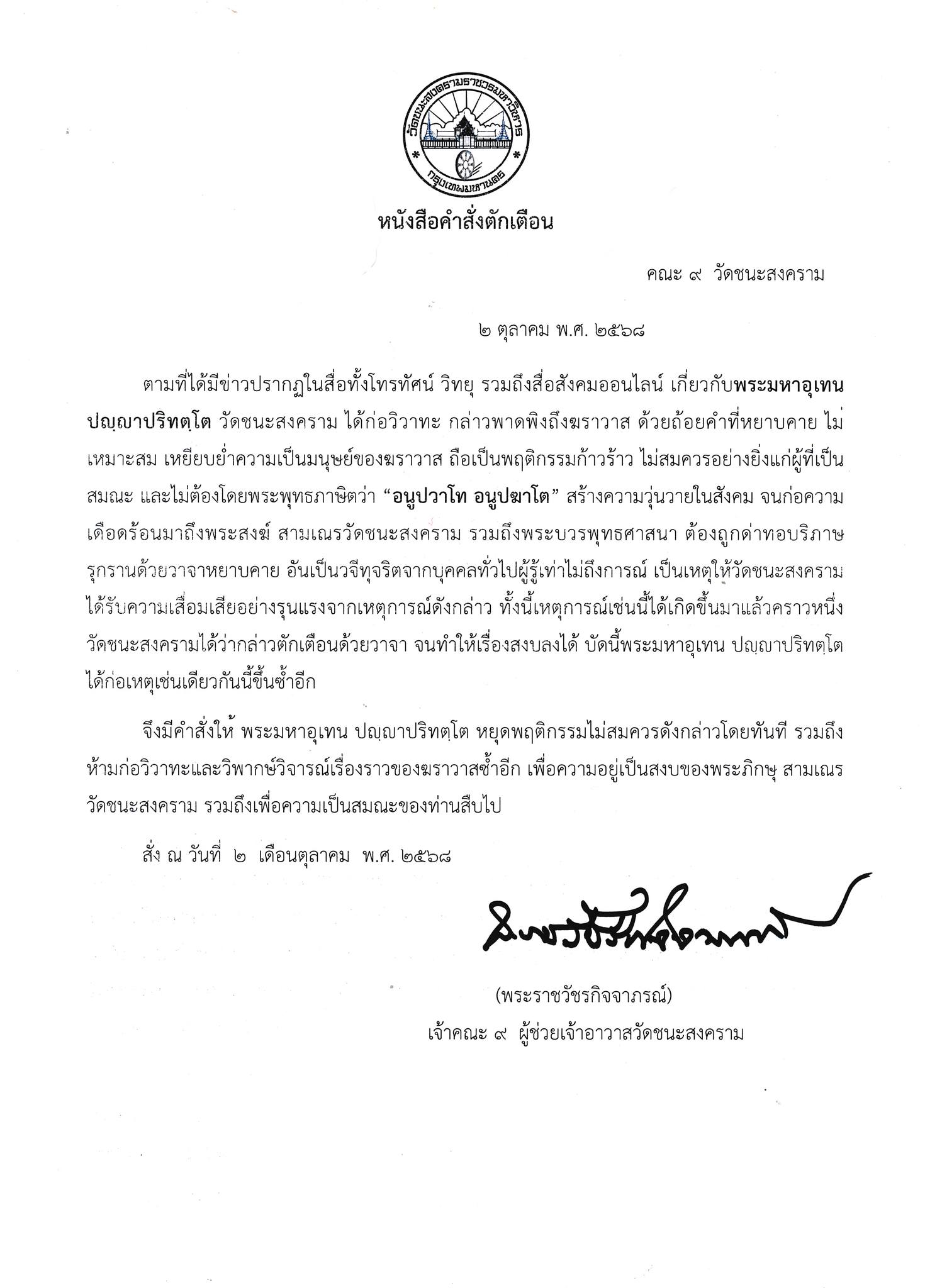 หนังสือคำสั่งตักเตือน คณะ 9 วัดชนะสงคราม ลงวันที่ 2 ตุลาคม พ.ศ. 2568 ตามที่ได้มีช่าวปรากฏในสื่อทั้งโทรทัศน์ วิทยุ รวมถึงสื่อสังคมออนไลน์ เกี่ยวกับพระมหาอุเทน ปญณาปริทตุโต วัดชนะสงคราม ได้ก่อวิวาทะ กล่าวพาดพิงถึงฆราวาส ด้วยถ้อยคำที่หยาบคาย ไม่เหมาะสม เหยียบยํ่าความเป็นมนุษย์ของฆราวาส ถือเป็นพฤติกรรมก้าวร้าว ไม่สมควรอย่างยิ่งแก่ผู้ที่เป็นสมณะ และไม่ต้องโดยพระพุทธภาษิตว่า “อนูปวาโท อนูปฆาโต” สร้างความวุ่นวายในสังคม จนก่อความ เดือดร้อนมาถึงพระสงฆ์ สามเณรวัดขนะสงคราม รวมถึงพระบวรพุทธศาสนา ต้องถูกด่าทอบริภาษ รุกรานด้วยวาจาหยาบคาย อันเป็นวจีทุจริตจากบุคคลทั่วไปผู้รู้เท่าไม่ถึงการณ์ เป็นเหตุให้วัดชนะสงคราม ได้รับความเสื่อมเสียอย่างรุนแรงจากเหตุการณ์ดังกล่าว ทั้งนี้เหตุการณ์เช่นนี้ได้เกิดขึ้นมาแล้วคราวหนึ่ง วัดชนะสงครามได้ว่ากล่าวตักเตือนด้วยวาจา จนทำให้เรื่องสงบลงได้ บัดนี้พระมหาอุเทน ปญณาปริทตุโต ได้ก่อเหตุเช่นเดียวกันนี้ขึ้นซํ้าอีก