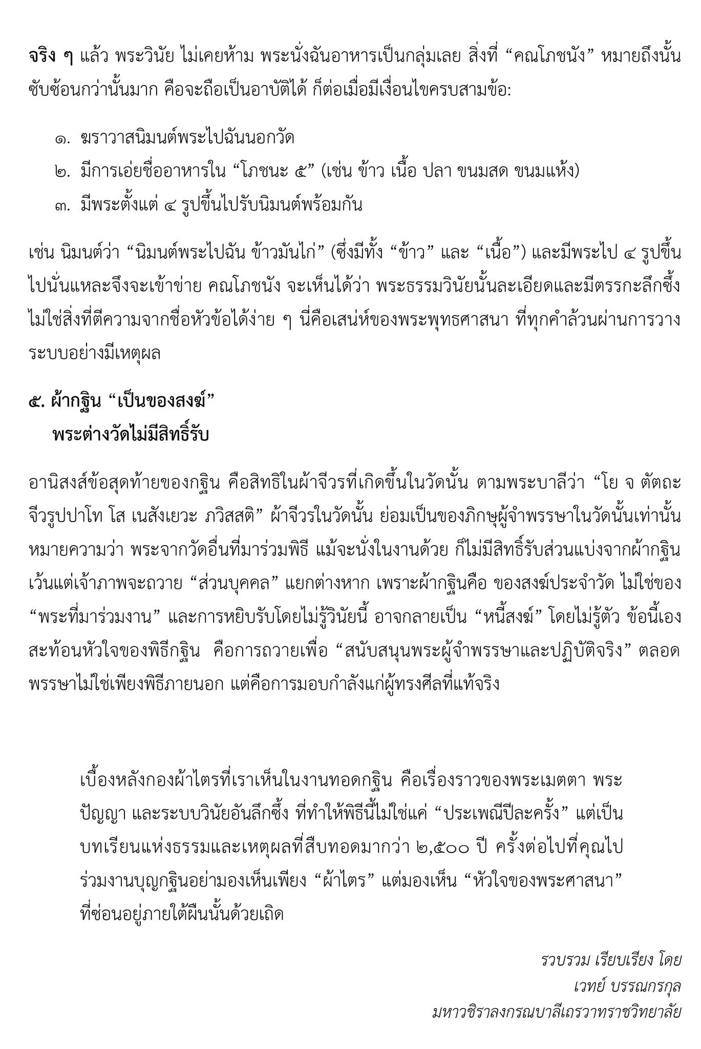 วันที่ 15 ตุลาคม 2568 กลายเป็นประเด็นข้อถกเถียง “อีกครั้ง”กรณี รศ.ดร.เวทย์ บรรณกรกุล อาจารย์ประจำมหาวชิราลงกรณบาลีเถรวาทราชวิทยาลัย ได้เผยแพร่บทความ “เรื่องจริงของ กฐิน ที่คนส่วนใหญ่ไม่เคยรู้” 5 เรื่องบางคนเข้าใจผิดมาทั้งชีวิต ว่าใน “ข้อเท็จจริง” เป็นไปดังที่ ดร.เวทย์ ได้สรุปไว้หรือไม่ โดยล่าสุด “พระเมธีวัชรบัณฑิต” ผอ.หลักสูตรสันติศึกษา มหาวิทยาลัยมหาจุฬาลงกรณราชวิทยาลัย ขอเป็น “โซ่ข้อกลาง” เตรียม “จัดโต๊ะกลม” ระดมนักวิชาการพระพุทธศาสนา สรุปประเด็นเสนอ “มหาเถรสมาคม” เพื่อเป็น “ข้อมูล” สรุปชี้ขาด โดยมีความว่า