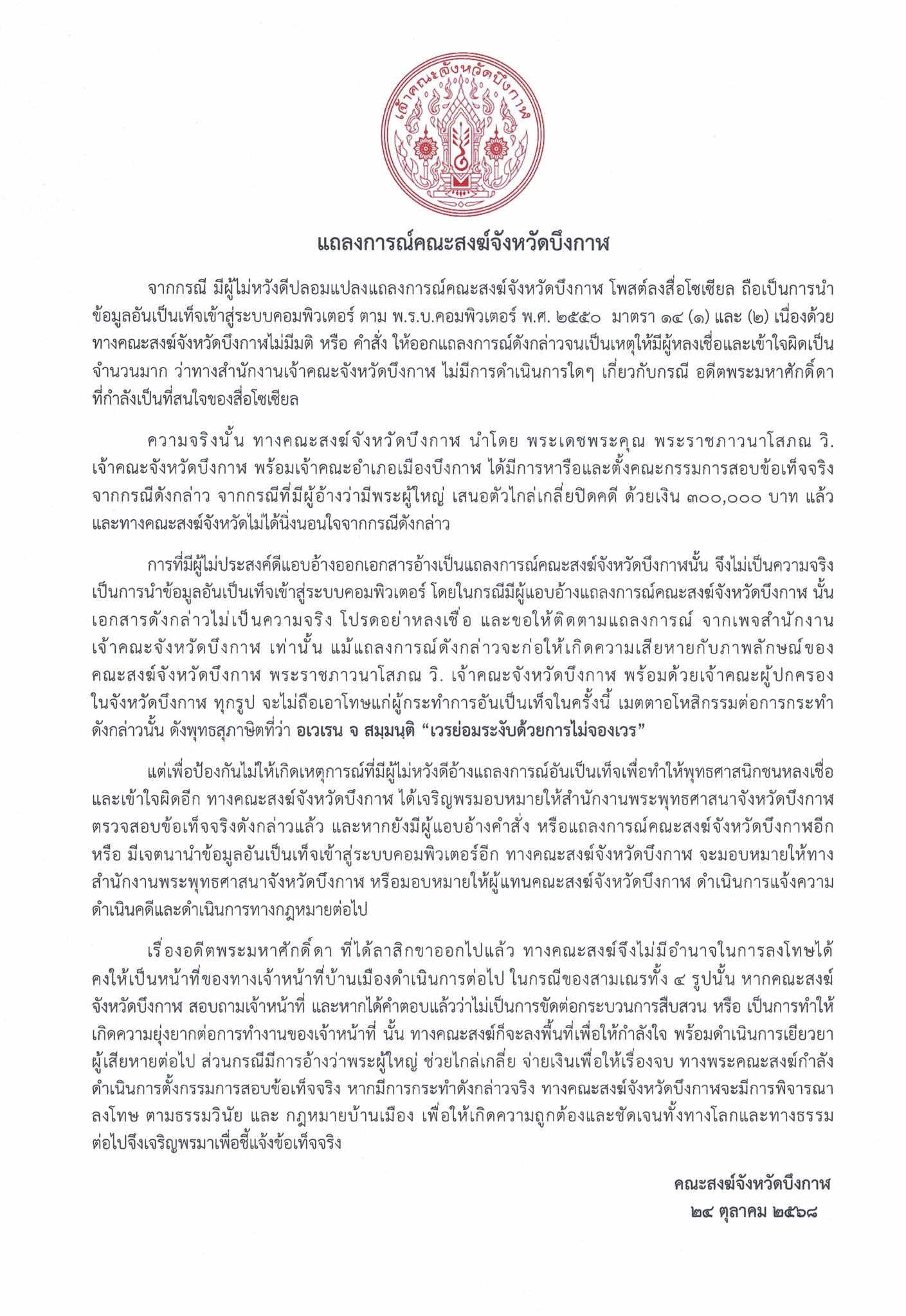 การที่มีผู้ไม่ประสงค์ดีแอบอ้างออกเอกสารอ้างเป็นแถลงการณ์คณะสงฆ์จังหวัดบึงกาฬนั้น จึงไม่เป็นความจริง เป็นการนำข้อมูลอันเป็นเท็จเข้าสู่ระบบคอมพิวเตอร์ โดยในกรณีมีผู้แอบอ้างแถลงการณ์คณะสงฆ์จังหวัดบึงกาฬ นั้น เอกสารดังกล่าวไม่เป็นความจริง โปรดอย่าหลงเชื่อ และขอให้ติดตามแถลงการณ์ จากเพจสำนักงาน เจ้าคณะจังหวัดบึงกาฬ เท่านั้น แม้แถลงการณ์ดังกล่าวจะก่อให้เกิดความเสียหายกับภาพลักษณ์ของคณะสงฆ์จังหวัดบึงกาฬ พระราชภาวนาโสภณ วิ. เจ้าคณะจังหวัดบึงกาฬ พร้อมด้วยเจ้าคณะผู้ปกครองในจังหวัดบึงกาฬ ทุกรูป จะไม่ถือเอาโทษแก่ผู้กระทำการอันเป็นเท็จในครั้งนี้ เมตตาอโหสิกรรมต่อการกระทำ ดังกล่าวนั้น ดังพุทธสุภาษิตที่ว่า อเวเรน จ สมฺมนฺติ “เวรย่อมระงับด้วยการไม่จองเวร”