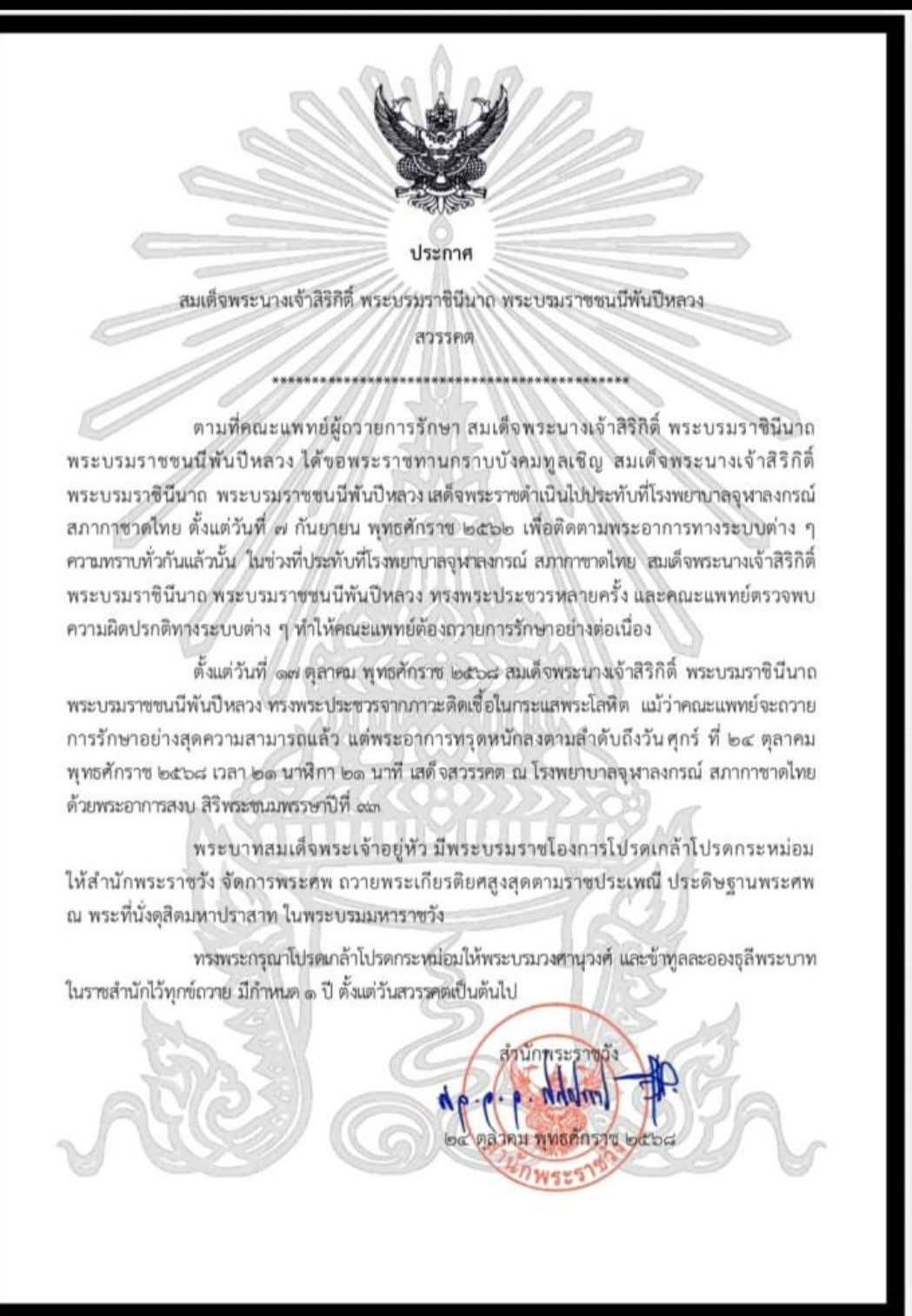 วันที่ 25 ตุลาคม 2568 ประกาศสำนักพระราชวัง เรื่อง สมเด็จพระนางเจ้าสิริกิติ์ พระบรมราชินีนาถ พระบรมราชชนนีพันปีหลวง สวรรคต ระบุว่า ตามที่คณะแพทย์ผู้ถวายการรักษา สมเด็จพระนางเจ้าสิริกิติ์ พระบรมราชินีนาถ พระบรมราชชนนีพันปีหลวง ได้ขอพระราชทานกราบบังคมทูลเชิญ สมเด็จพระนางเจ้าสิริกิติ์ พระบรมราชินีนาถ พระบรมราชชนนีพันปีหลวง เสด็จพระราชดำเนินไปประทับที่โรงพยาบาลจุฬาลงกรณ์ สภากาชาดไทย ตั้งแต่วันที่ 7 กันยายน พุทธศักราช 2562 เพื่อติดตามพระอาการทางระบบต่างๆ ความทราบทั่วกันแล้วนั้น ในช่วงที่ประทับที่โรงพยาบาลจุฬาลงกรณ์ สภากาชาดไทย สมเด็จพระนางเจ้าสิริกิติ์ พระบรมราชินีนาถ พระบรมราชชนนีพันปีหลวง ทรงพระประชวรหลายครั้ง และคณะแพทย์ตรวจพบความผิดปรกติทางระบบต่างๆ ทำให้คณะแพทย์ต้องถวายการรักษาอย่างต่อเนื่อง