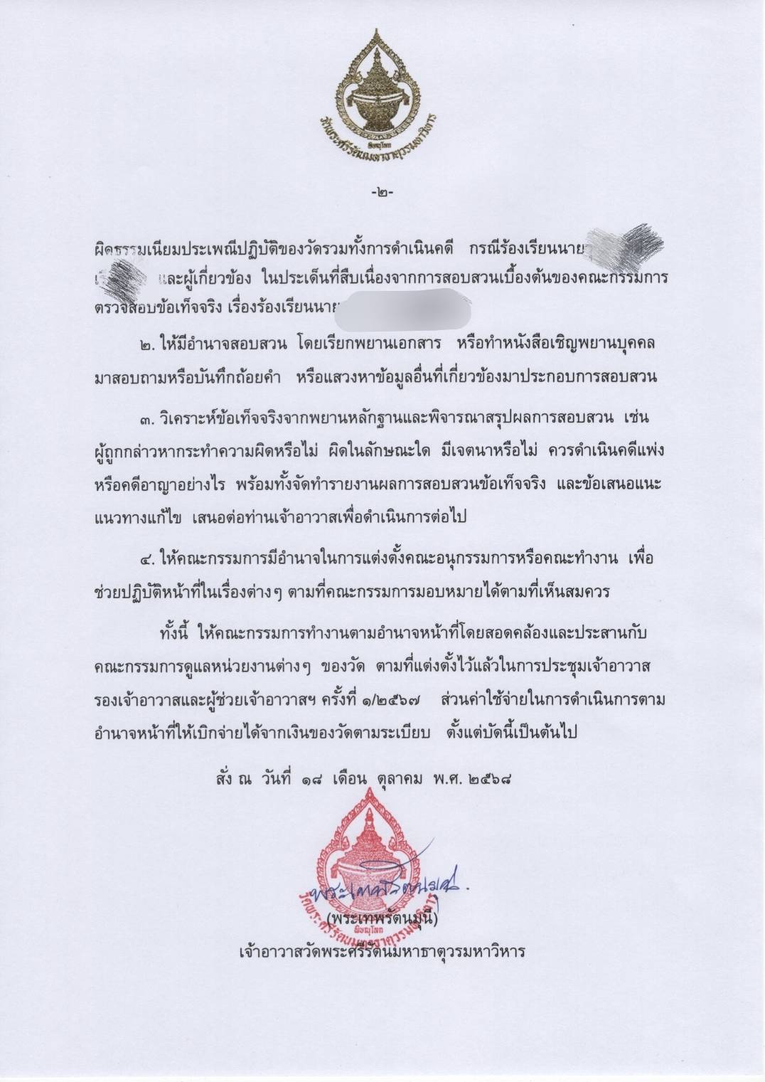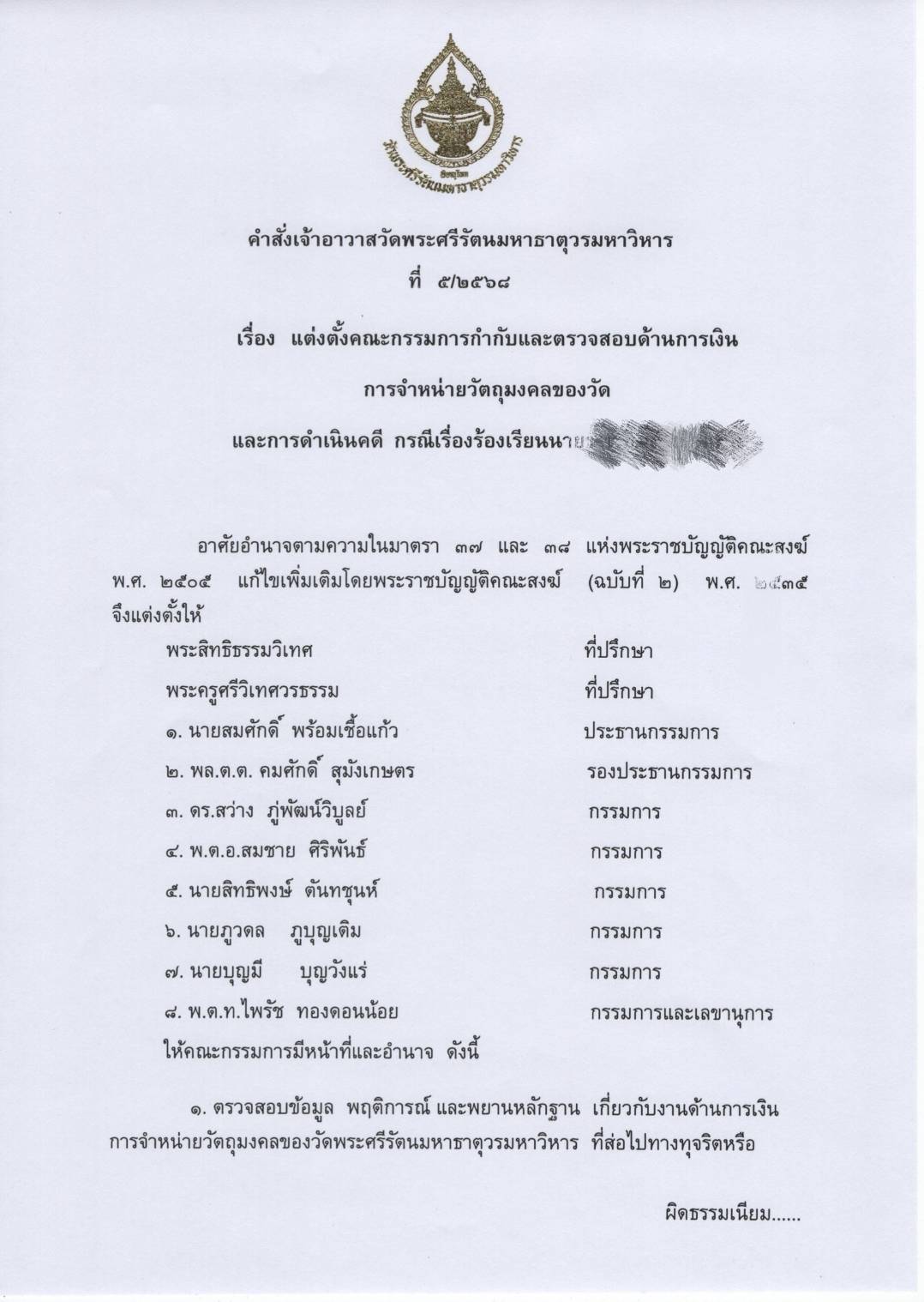 วันที่ 27 ตุลาคม 2568 เปิดคำสั่ง พระเทพรัตนมุนี เจ้าอาวาสวัดพระศรีรัตนมหาธาตุวรมหาวิหาร เรื่อง แต่งตั้งคณะกรรมการกำกับและตรวจสอบด้านการเงิน การจำหน่ายวัตถุมงคลของวัด และการดำเนินคดี กรณีเรื่องร้องเรียนนาย….โดยอาศัยอำนาจตามความในมาตรา 37 และ 38 แห่งพระราชบัญญัติคณะสงฆ์ พ.ศ. 2505แก้ไขเพิ่มเติมโดยพระะราชบัญญัติคณะสงฆ์ (ฉบับที่ 2) พ.ศ. 2535 จึงแต่งตั้งคณะกรรมการตรวจสอบด้านการเงินและการทุจริต โดยให้มีหน้าที่และอำนาจดังนี้