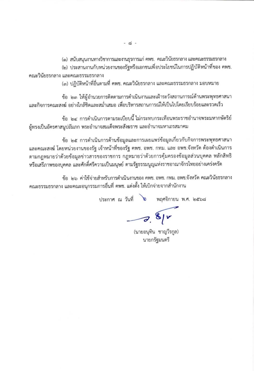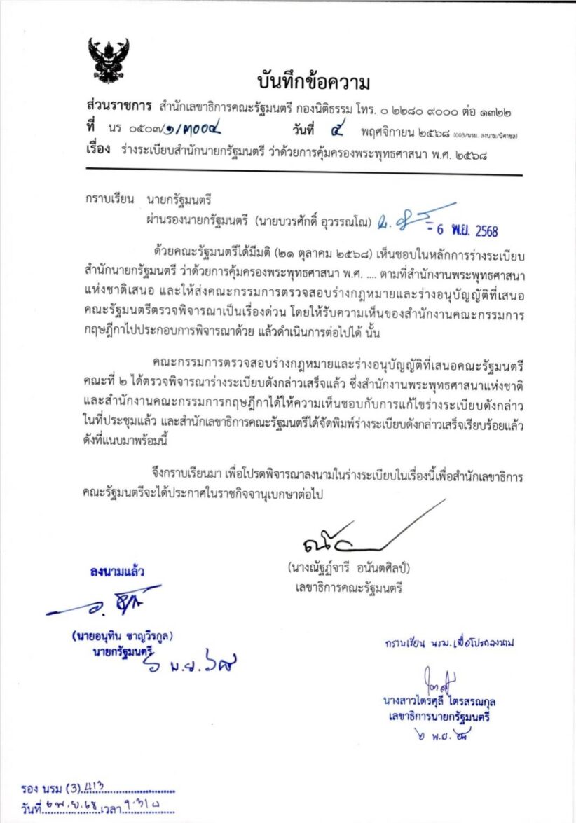 วันที่ 6 พฤศจิกายน 2568 นายอนุทิน ชาญวีรกุล นายกรัฐมนตรี ได้ลงนามระเบียบสำนักนายกรัฐมนตรีว่าด้วยการคุัมครองพระพุทธศาสนาแล้วดังมีความว่าด้วยคณะรัฐมนตรีได้มีมติ (21ตุลาคม 2568) เห็นชอบในหลักการร่างระเบียบ สำนักนายกรัฐมนตรี ว่าด้วยการคุ้มครองพระพุทธศาสนา พ.ศ. …. ตามที่สำนักงานพระพุทธศาสนาแห่งชาติเสนอ และให้ส่งคณะกรรมการตรวจสอบร่างกฎหมายและร่างอนุบัญญัติที่เสนอ คณะรัฐมนตรีตรวจพิจารณาเป็นเรื่องด่วน โดยให้รับความเห็นของสสำนักงานคณะกรรมการกฤษฎีกาไปประกอบการพิจารณาด้วย แล้วดำเนินการต่อไปได้นั้น