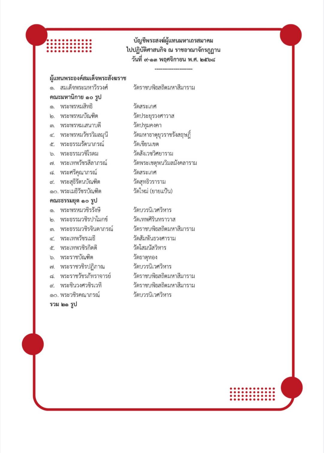 สำหรับรายชื่อพระภิกษุไทยทั้ง 21 รูปมีดังนี้