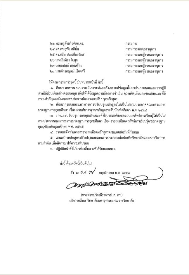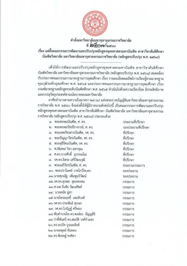 อาศัยอำนาจตามความในมาตรา 27 (1) แห่งพระราชบัญญัติมหาวิทยาลัยมหาจุฬาลงกรณราชวิทยาลัย พ.ศ.2540 จึงแต่งตั้งให้ผู้มีรายนามดังต่อไปนี้ เป็นคณะกรรมการพัฒนาและปรับปรุงหลักสูตรพุทธศาสตรมหาบัณฑิต สาขาวิชาสันติศึกษา บัณฑิตวิทยาลัย มหาวิทยาลัยมหาจุฬาลงกรณ ราชวิทยาลัย (หลักสูตรปรับปรุง พ.ศ. 2568 ) ประกอบด้วย รายนามดังต่อไปนี้