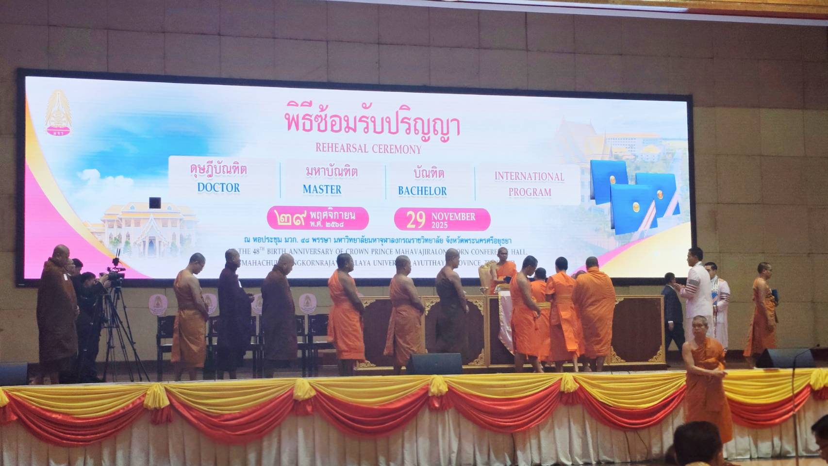วันที่ 29 พฤศจิกายน 2568 เวลา 13.00 ณ อาคาร มวก.48 พรรษา มหาวิทยาลัยมหาจุฬาลงกรณราชวิทยาลัย พระพรหมวัชรธีราจารย์ อธิการบดีมหาวิทยาลัยมหาจุฬาลงกรณราชวิทยาลัย เป็นประธานการซ้อมรับปริญญาประจำปี 2568 โดยมี พระเทพวัชรสารบัณฑิต รองอธิการบดีฝ่ายวางแผนและพัฒนา พระปัญญาวัชรบัณฑิต รองอธิการบดีฝ่ายวิชาการ ดร.สุรพล สุยะพรหม รองอธิการบดีฝ่ายกิจการทั่วไป คณบดี ผู้บริหาร คณาจารย์ เจ้าหน้าที่ พร้อมด้วยบัณฑิตทุกระดับส่วนกลาง ประมาณ 1,000 รูป/คน ร่วมเข้าซ้อมรับปริญญาโดยพร้อมเพรียง