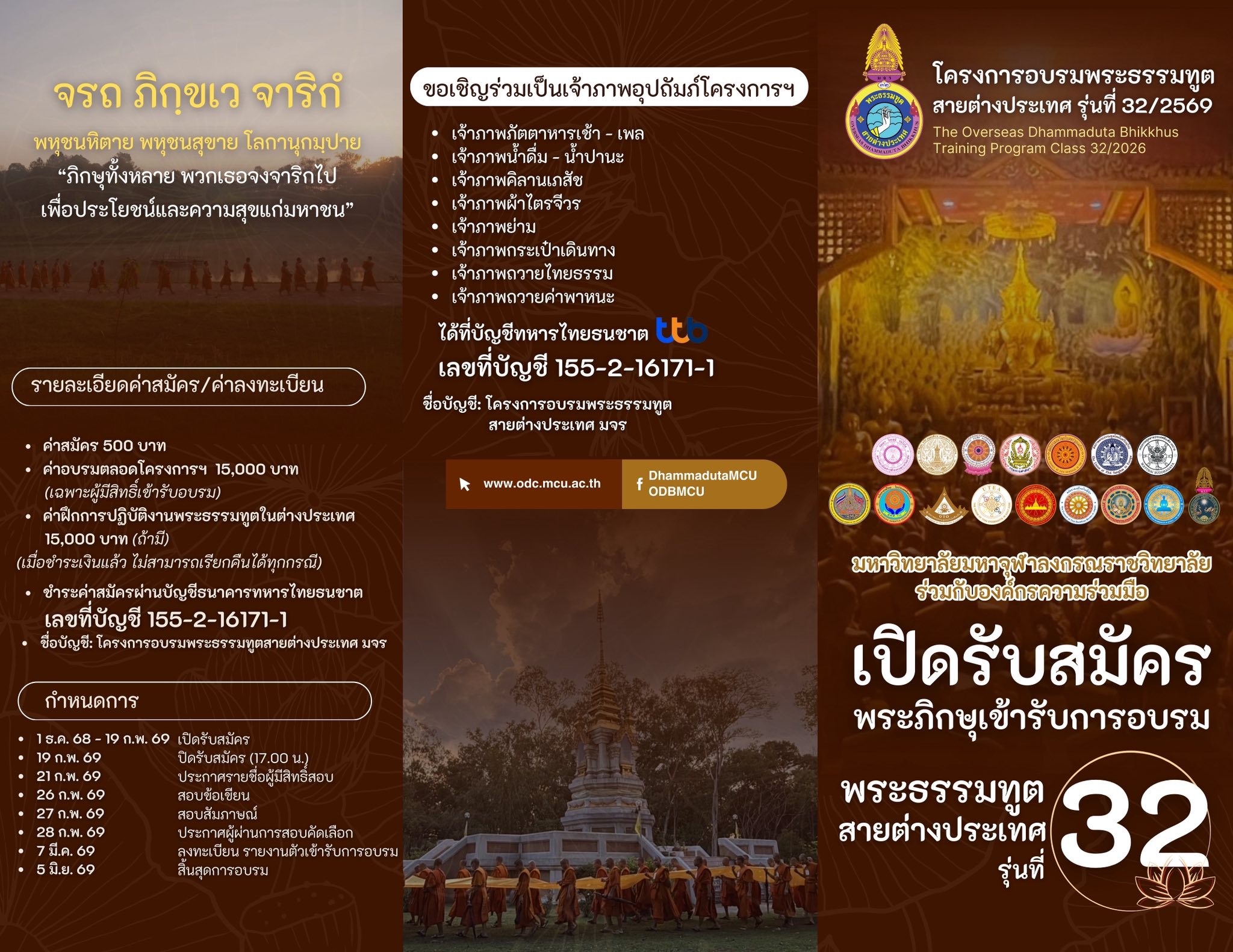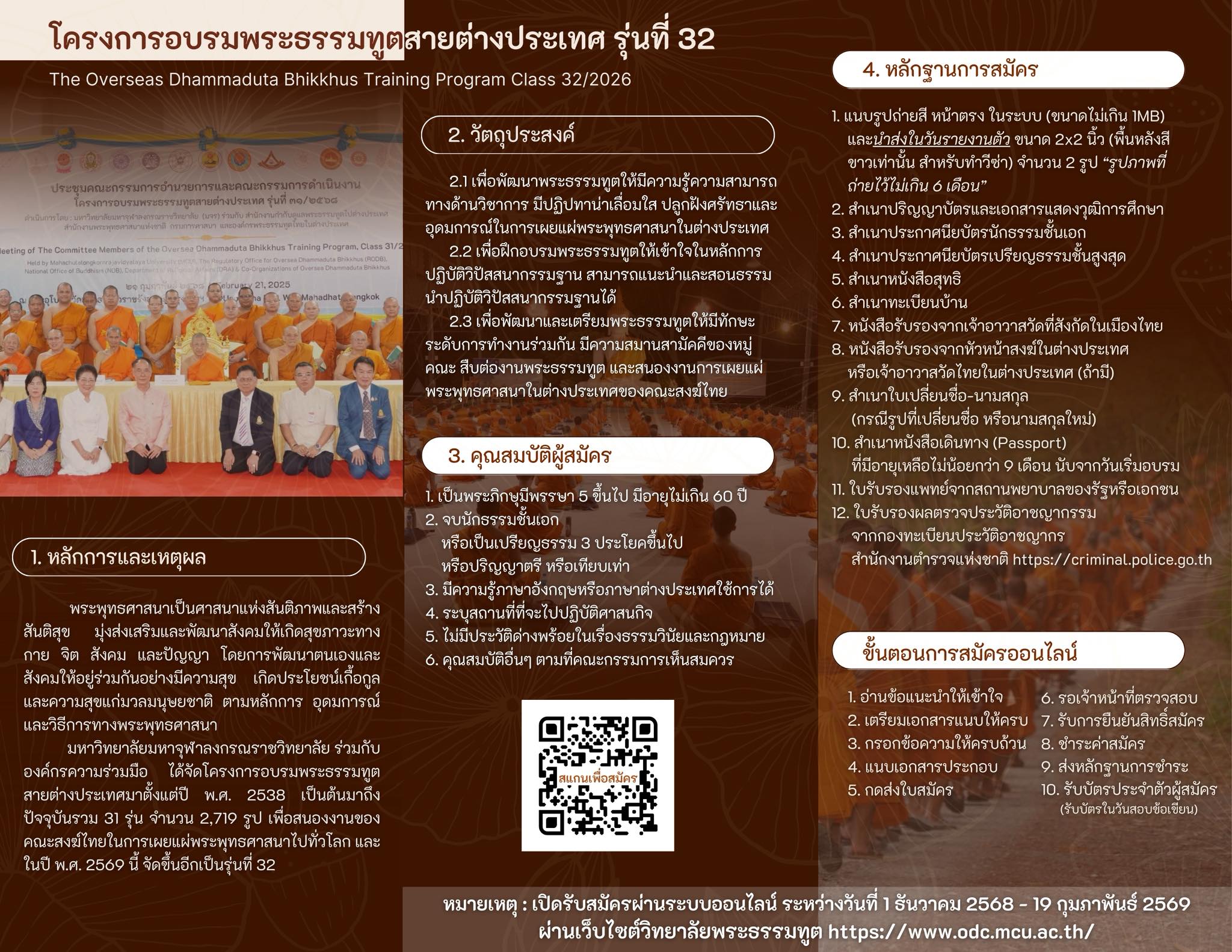 วันที่ 2 ธันวาคม 2568 มีรายงานว่า มหาวิทยาลัยมหาจุฬาลงกรณราชวิทยาลัย รับสมัครพระภิกษุเข้าร่วมโครงการอบรมพระธรรมทูตสายต่างประเทศ โดยมี วิทยาลัยพระธรรมทูต มจร ร่วมกับองค์กรภาคีเครือข่าย เปิดรับสมัครพระภิกษุเข้ารับการฝึกอบรมพระธรรมทูตสายต่างประเทศ รุ่นที่ 32/2568 โครงการอบรมพระธรรมทูตได้ดำเนินมาแล้ว 31 รุ่น ตั้งแต่ปี 2538 จนถึงปัจจุบัน มีผู้ผ่านการอบรมและไปปฎิบัติหน้าที่เป็นพระธรรมทูตสายต่างประเทศแผยแผ่พระพทุธศาสนาอยู่ทั่วโลก รวมจำนวนทั้งสิ้น 2,719 รูป