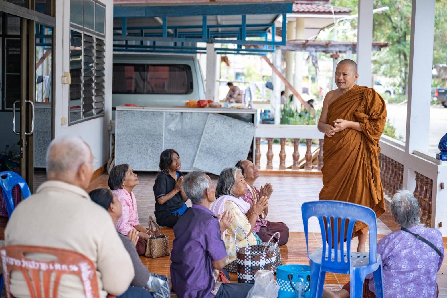 พร้อมกับกล่าวว่า แม้จะกำลังใจว่า ให้ถือเสียว่าพ่อแม่ปู่ยาตายายได้พาลูกหลายมาปฏิบัติธรรมในวัด แต่ดูแววและน้ำเสียงก็ทำให้รับรู้ถึงความกังวลที่ต้องพากันหนีออกจากพื้นที่มีความเสี่ยงจากการสู่รบ ถึงกระนั้น ก็ยังคงมีพ่อบ้านจำนวนไม่น้อยที่ยังไม่ยอมอพยพออกมาเพราะต้องรักษาทรัพย์สมบัติในบ้าน