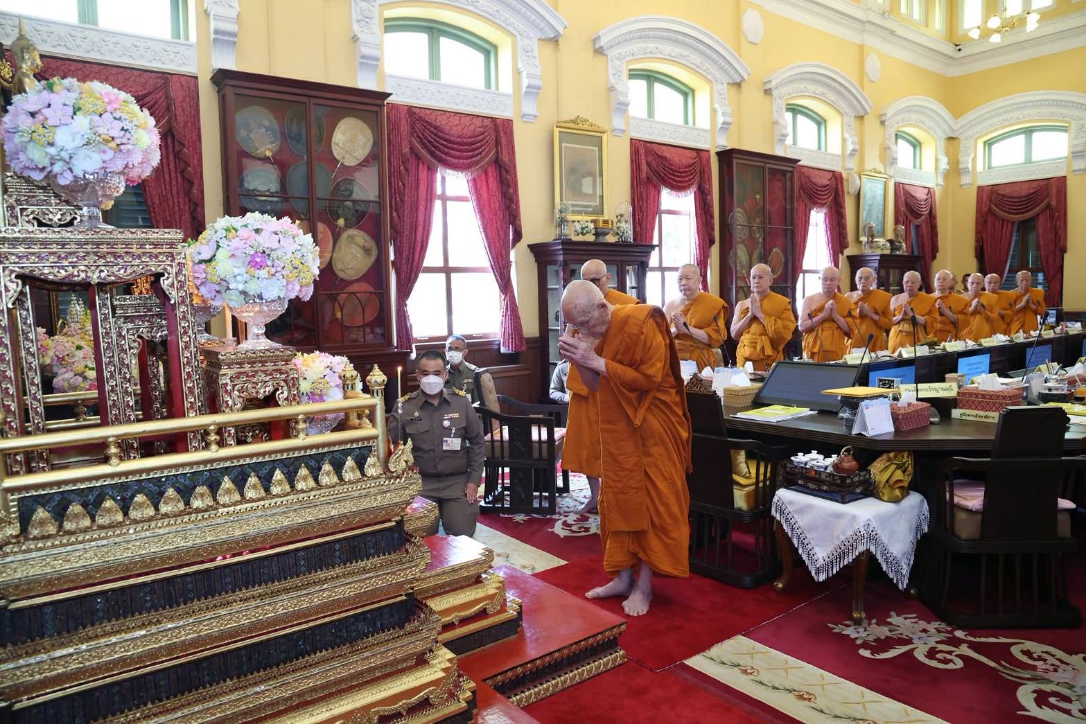 จากนั้น เสด็จออกท้องพระโรง ทรงจุดธูปเทียนบูชาพระรัตนตรัย และทรงจุดธูปเทียนถวายสักการะพระรูปเจ้าพระคุณ สมเด็จพระมหาสมณเจ้า กรมพระยาวชิรญาณวโรรส ทรงนำสวดมนต์บูชาพระรัตนตรัย ประทานพระวโรกาสให้ผู้แทนกรรมการมหาเถรสมาคมเฝ้าถวายเครื่องสักการะ แล้วประทับเป็นประธานการประชุมมหาเถรสมาคม ครั้งที่ ๓๐/๒๕๖๘ โดยมีนางอุดมพร เอกเอี่ยม ผู้อำนวยการสำนักงานพระพุทธศาสนาแห่งชาติทำหน้าที่เลขาธิการมหาเถรสมาคม จากนั้น ได้ดำเนินการประชุมตามระเบียบวาระ