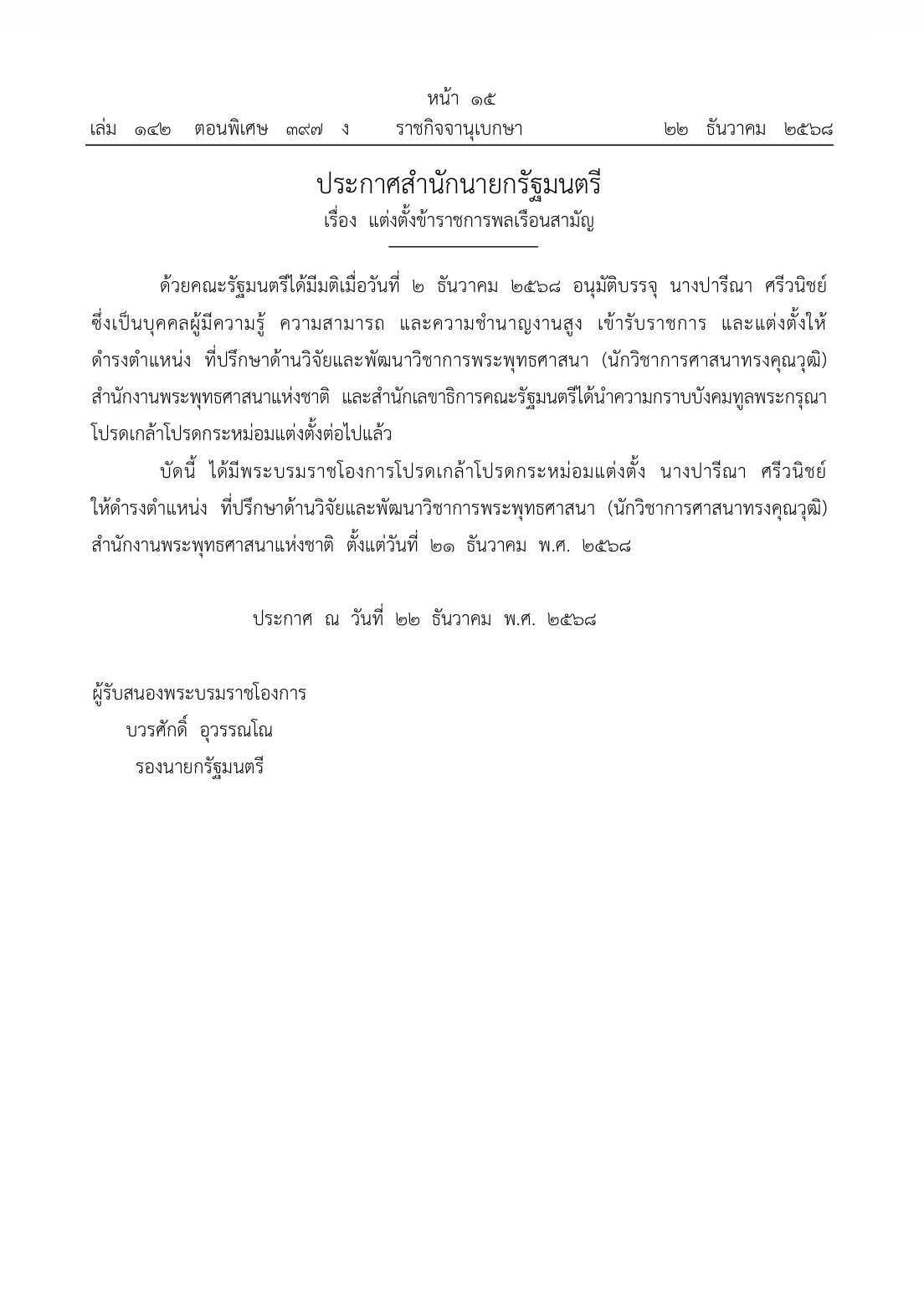 บัดนี้ ได้มีพระบรมราชโองการโปรดเกล้าโปรดกระหม่อมแต่งตั้ง นางปารีณา ศรีวนิชย์ ให้ดำรงตำแหน่ง ที่ปรึกษาด้านวิจัยและพัฒนาวิชาการพระพุทธศาสนา (นักวิชาการศาสนาทรงคุณวุฒิ) สำนักงานพระพุทธศาสนาแห่งชาติ ตั้งแต่วันที่ 21 ธันวาคม พ.ศ. 2568 ผู้รับสนองพระบรมราชโองการ