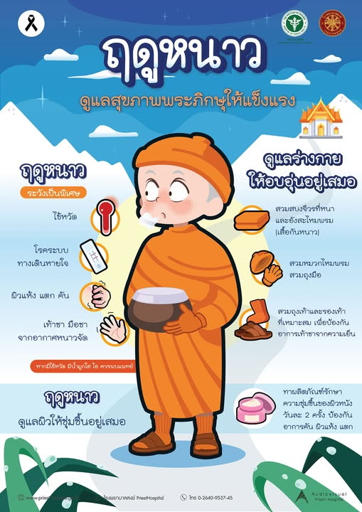 วันที่ 9 ม.ค.69 นายแพทย์ไพโรจน์ สุรัตนวนิช รองอธิบดีกรมการแพทย์ กล่าวว่า ขณะนี้สภาพอากาศของประเทศไทย เริ่มมีอากาศหนาวเย็น โดยเฉพาะภาคเหนือและภาคตะวันออกเฉียงเหนือ และอาจส่งผลให้ร่างกายปรับตัวไม่ทัน เกิดการเจ็บป่วยด้วยโรคเกี่ยวกับระบบทางเดินหายใจได้ง่าย เช่น ไข้หวัดใหญ่ ปอดบวม และหลอดลมอักเสบ อีกทั้งในช่วงอากาศหนาวอาจทำให้เกิดโรคติดเชื้อได้ง่าย โดยเฉพาะในกลุ่มผู้สูงอายุ และเด็กเล็ก ซึ่งในกลุ่มพระภิกษุสูงอายุและสามเณร อาจทำให้อาพาธได้ง่ายกว่าปกติ แนะรักษาร่างกายให้อบอุ่นอยู่เสมอ พักอยู่ในที่อบอุ่นหรือที่สามารถป้องกันลมหนาวได้ ฉันอาหารที่ปรุงสุกใหม่ ๆ และมีประโยชน์ให้ครบ 5 หมู่ ฉันน้ำปานะหรือเครื่องดื่มอุ่นๆ จะช่วยปรับสมดุลให้ร่างกาย และหมั่นล้างมือด้วยสบู่ให้สะอาดอยู่เสมอทั้งก่อนและหลังฉันอาหาร เพื่อลดการสะสมของเชื้อโรคที่จะก่อให้เกิดโรคต่าง ๆ ในหน้าหนาว