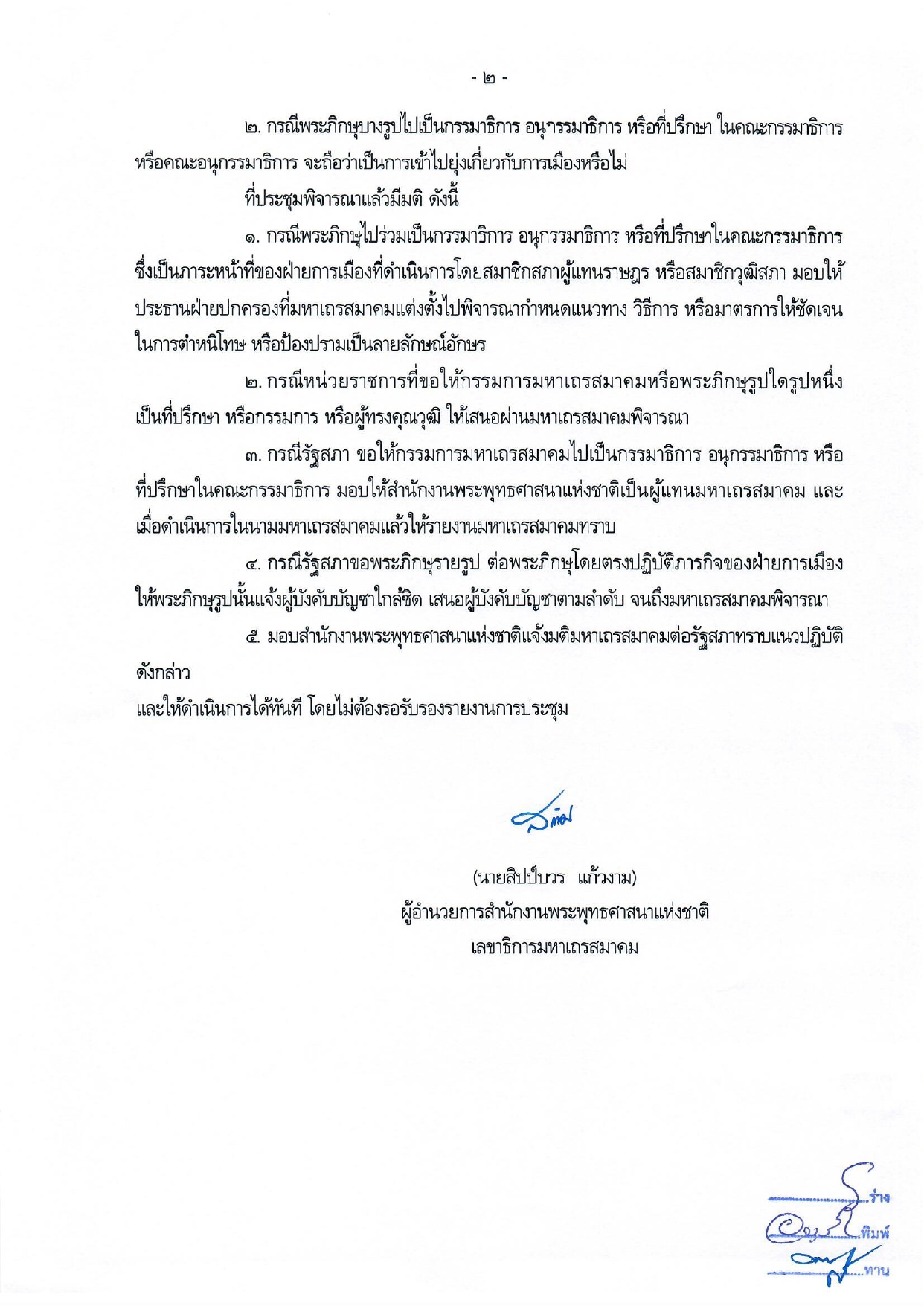 และ หรือ หากรัฐสภา ประกอบด้วย สภาผู้แทนราษฎร วุฒิสภา จะขอพระภิกษุรูปใดไปเป็นอนุกรรมาธิการ หรือปฏิบัติภารกิจของฝ่ายการเมือง ให้พระภิกษุรูปนั้นแจ้งผู้บังคับบัญชาใกล้ชิด เสนอผู้บังคับบัญชาตามลำดับ จนถึงมหาเถรสมาคมพิจารณา..