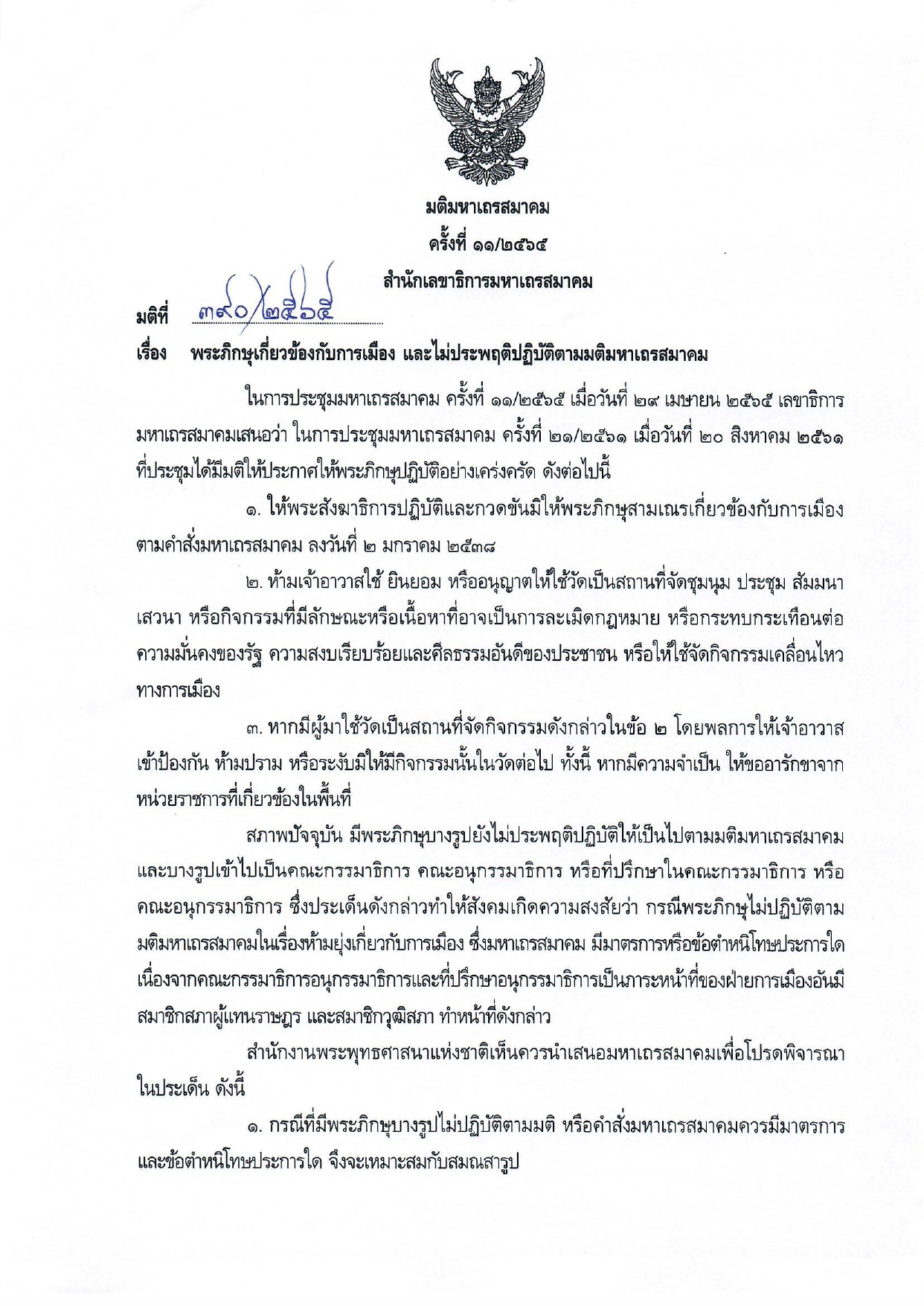 ต่อเมื่อปีพ.ศ.2565 มหาเถรสมาคมมีมติย้ำอีกรอบห้ามพระภิกษุยุ่งการเมือง ในขณะเข้าไปร่วมเป็นกรรมาธิการ อนุกรรมาธิการ หรือที่ปรึกษาในคณะกรรมาธิการ ซึ่งมหาเถรสมาคมมองว่า เป็นภาระหน้าที่ของฝ่ายการเมือง ที่ดำเนินการโดยสมาชิกสภาผู้แทนราษฎร หรือสมาชิกวุฒิสภา ห้ามพระภิกษุฝ่าฝืนมหาเถรสมาคมจะมีมาตรการลงโทษ