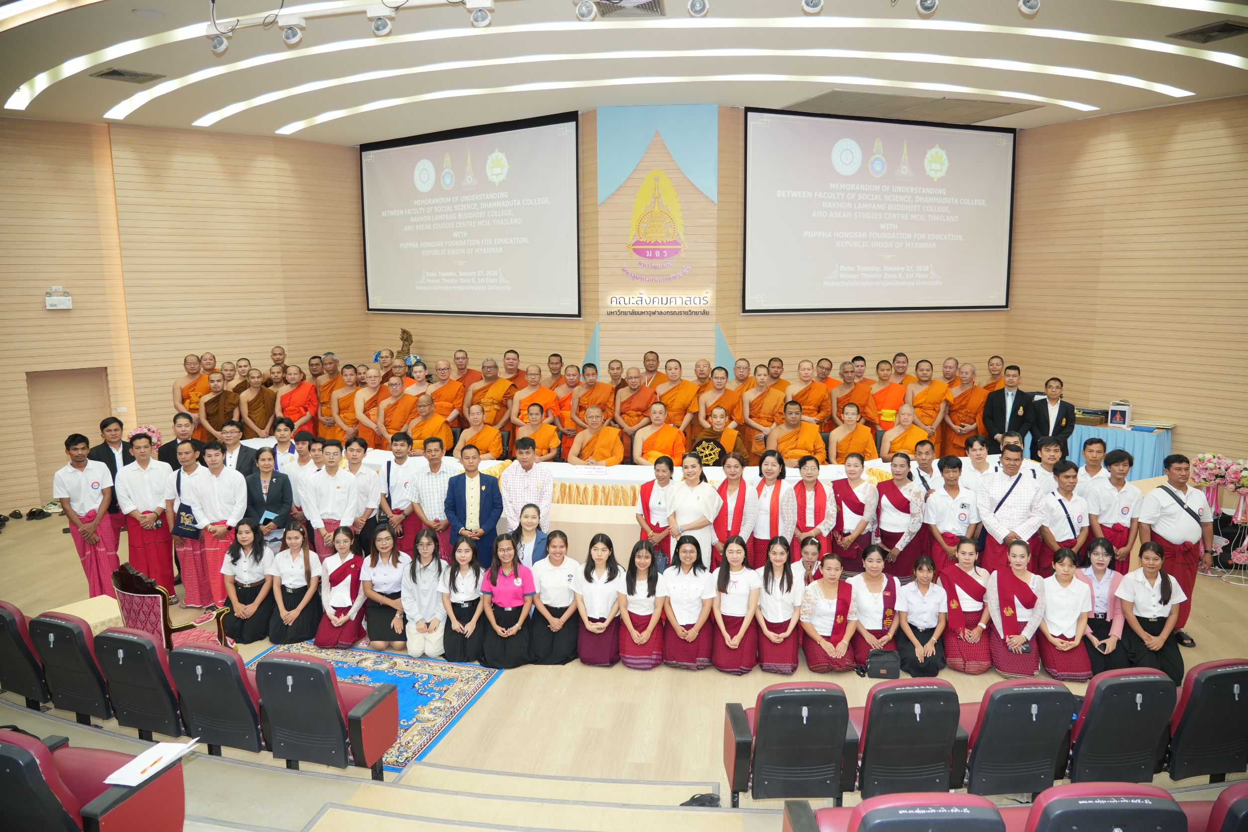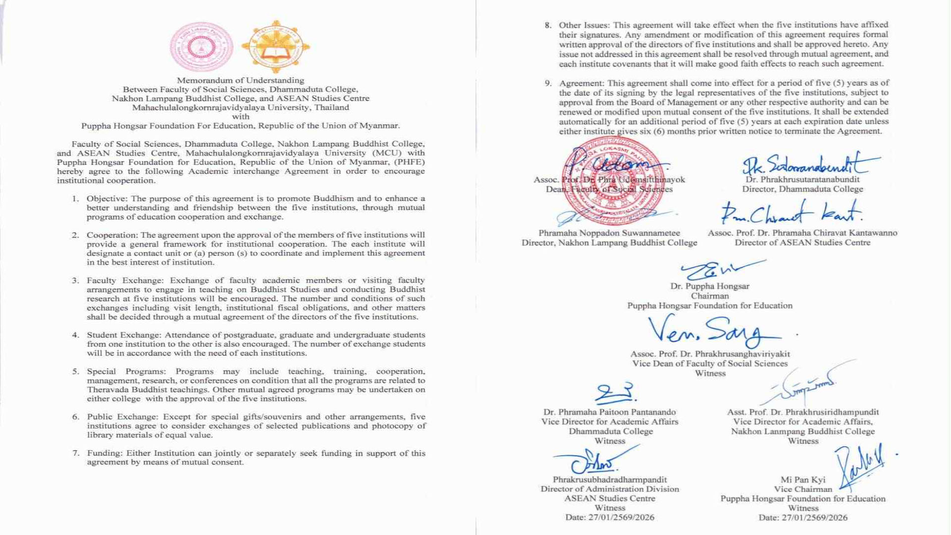 วันอังคารที่ 27 มกราคม 2569 เวลา 13.00 น. ที่ห้องเธียเตอร์ คณะสังคมศาสตร์ มหาวิทยาลัยมหาจุฬาลงกรณราชวิทยาลัย พระสิทธิวัชรบัณฑิต รองอธิการบดีฝ่ายกิจการต่างประเทศ เป็นประธานในพิธีจัดลงนามบันทึกข้อตกลงความร่วมมือ (MOU) ระหว่าง มูลนิธิ Puppha Hongsar กับ คณะสังคมศาสตร์ วิทยาลัยพระธรรมทูต ศูนย์อาเซียนศึกษา วิทยาลัยสงฆ์ลำปาง โดยมี พระอุดมสิทธินายก คณบดีคณะสังคมศาสตร์ พระครูสุตรัตนบัณฑิต ผู้อำนวยการวิทยาลัยพระธรรมทูต ตัวแทน ผู้อำนวยการวิทยาลัยสงฆ์นครลำปาง พระมหาจีรวัฒน์ กนฺตวณฺโณ ผู้อำนวยการศูนย์ศึกษาอาเซียน พร้อมด้วยคณาจารย์ เจ้าหน้าที่ ชมรมนิสิตมอญและพี่น้องชาวมอญร่วมเป็นสักขีพยาน