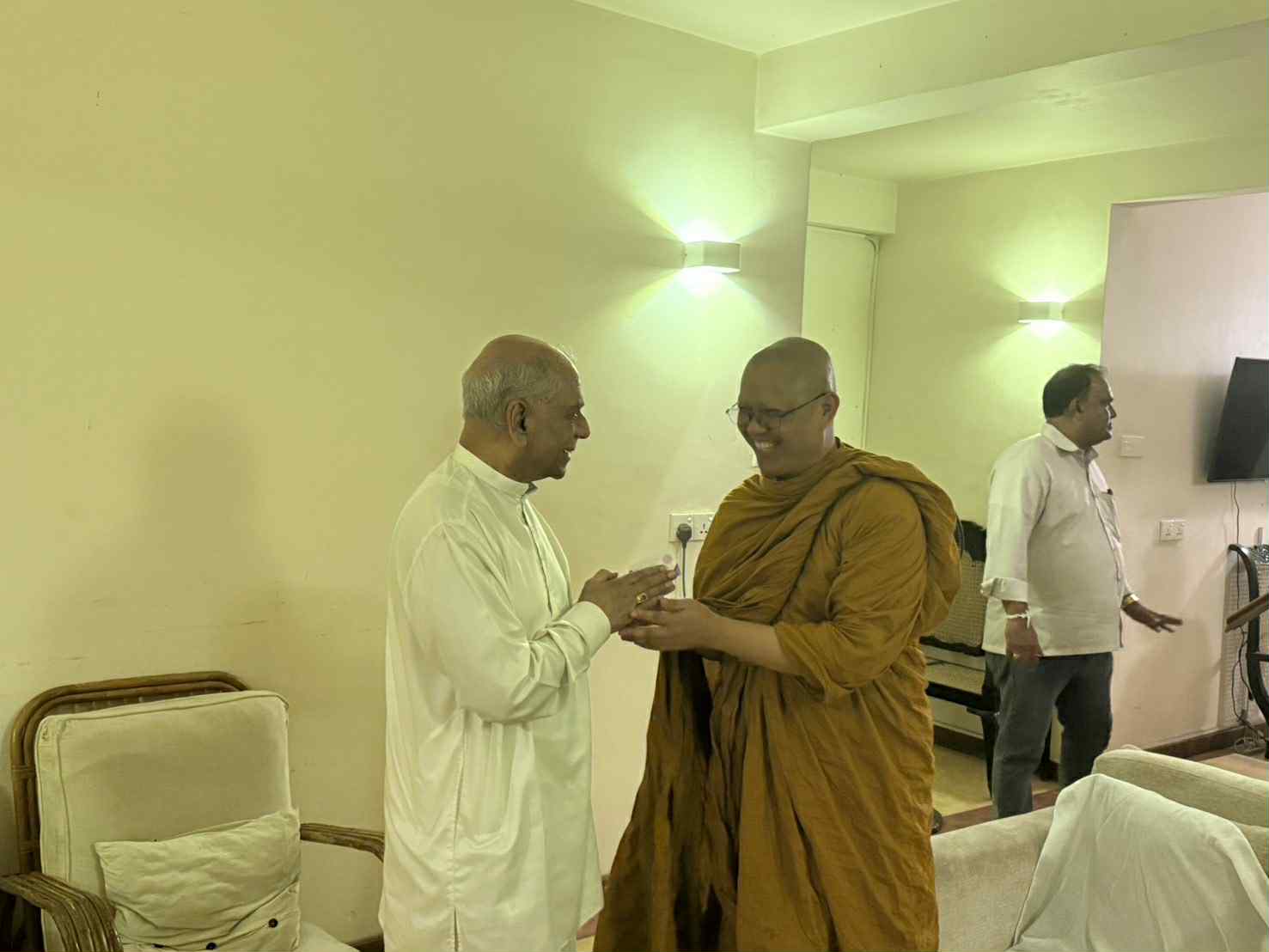 โอกาสนี้ ฯพณฯ อดีตนายกรัฐมนตรีศรีลังกา ได้น้อมถวายน้ำชาแก่รองอธิการบดีฝ่ายกิจการต่างประเทศ และคณะ พร้อมกับปรารภเรื่องความสัมพันธ์ด้านพระพุทธศาสนา สมณทูต ระหว่างคณะสงฆ์ศรีลังกา คณะสงฆ์ไทยและมหาวิทยาลัยมหาจุฬาลงกรณราชวิทยาลัย และกล่าวขอบคุณรองอธิการบดีฝ่ายกิจการต่างประเทศ ที่เดินทางมาเยี่ยม ณ บ้านพักรับรอง ทั้งยังปรารภว่า หากมีโอกาสจะเดินทางไปนมัสการรองอธิการบดีฝ่ายกิจการต่างประเทศ ณ วัดราชสิทธารามราชวรวิหาร และ มจร