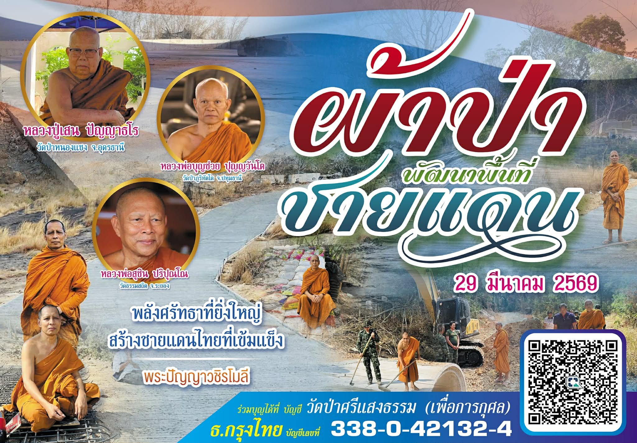 วันที่ 20 ก.พ. 69 พระปัญญาวชิรโมลี “เจ้าคุณเสียดายแดด” วัดป่าศรีแสงธรรม อ.โขงเจียม จ.อุบลราชธานี ซึ่งเป็นพระภิกษุที่สนับสนุนภารกิจทหารและช่วยเหลือประชาชนตามแนวชายแดนตั้งแต่วิกฤติชายแดนไทย -กัมพูชา ได้โพสต์ชวนทอดผ้าเพื่อ “พัฒนาพื้นที่ชายแดน” ความว่า พระอาจารย์บุญช่วย ปุญญวันโต วัดป่าภูริทัตปฏิปทาราม และพระอาจารย์สุชิน ปริปุญโณ วัดธรรมสถิต และคณะศรัทธาญาติโยม ได้มาเยี่ยมชมสถานที่ประดิษฐานพระเจ้าตาก และพระพุทธรูปบนยอดเขา พร้อมกับมาให้กำลังใจทหารและติดตามโครงการพัฒนาพื้นที่ชายแดน ที่กำลังจะทำเขื่อนกั้นน้ำเชื่อมภูเขาเข้าสู่ฐานปฏิบัติการ และเทถนนคอนกรีตประมาณ 1,300 เมตร และอื่น ๆ ตามความจำเป็นเร่งด่วน เพื่อเสริมสร้างความมั่นคงสู่ชายแดน