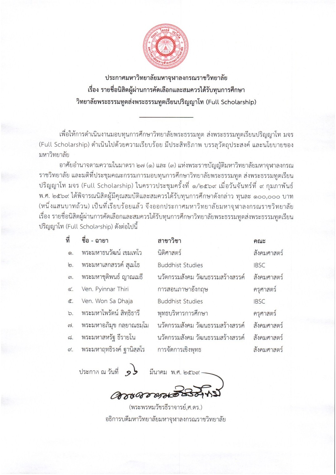 วันจันทร์ที่ 16 มีนาคม 2569 เวลา 10.30 น. พระพรหมวัชรธีราจารย์ อธิการบดีมหาวิทยาลัยมหาจุฬาลงกรณราชวิทยาลัย (มจร) ได้ลงนามประกาศรายชื่อพระนิสิตปริญญาโทที่สามารถสอบชิงทุนวิทยาลัยพระธรรมทูตได้จำนวน ๙ ทุน ๆละ ๑๐๐,๐๐๐ บาท ประกอบด้วย 1.พระมหาธนวัฒน์ เขมเทโว สาขาวิชานิติศาสตร์ คณะสังคมศาสตร์ 2.พระมหาเสกสรรค์สุเมโธ Buddhist Studies IBSC 3.พระมหาชุติพนธ์ ญาณเมธี สาขาวิชานวัตกรรมสังคมวัฒนธรรมสร้างสรรค์ คณะสังคมศาสตร์ 4.Ven. Pyinnar Thiri สาขา การสอนภาษาอังกฤษ ครุศาสตร์ 5.Ven. Won Sa Dhaja สาขาวิชา Buddhist Studies IBSC 6.พระมหาไพรัตน์ สิทฺธิธารี สาขาพุทธบริหารการศึกษา คณะครุศาสตร์ 7.พระมหาอภิมุข กลฺยาณธมฺโม สาขาวิชานวัตกรรมสังคม วัฒนธรรมสร้างสรรค์ คณะสังคมศาสตร์ 8.พระมหาสหรัฐ ธีรายโน สาขานวัตกรรมสังคม วัฒนธรรมสร้างสรรค์ คณะสังคมศาสตร์ และ 9.พระมหาฤทธิรงค์ ฐานิสฺสโร สาขาวิชาการจัดการเชิงพุทธ คณะสังคมศาสตร์