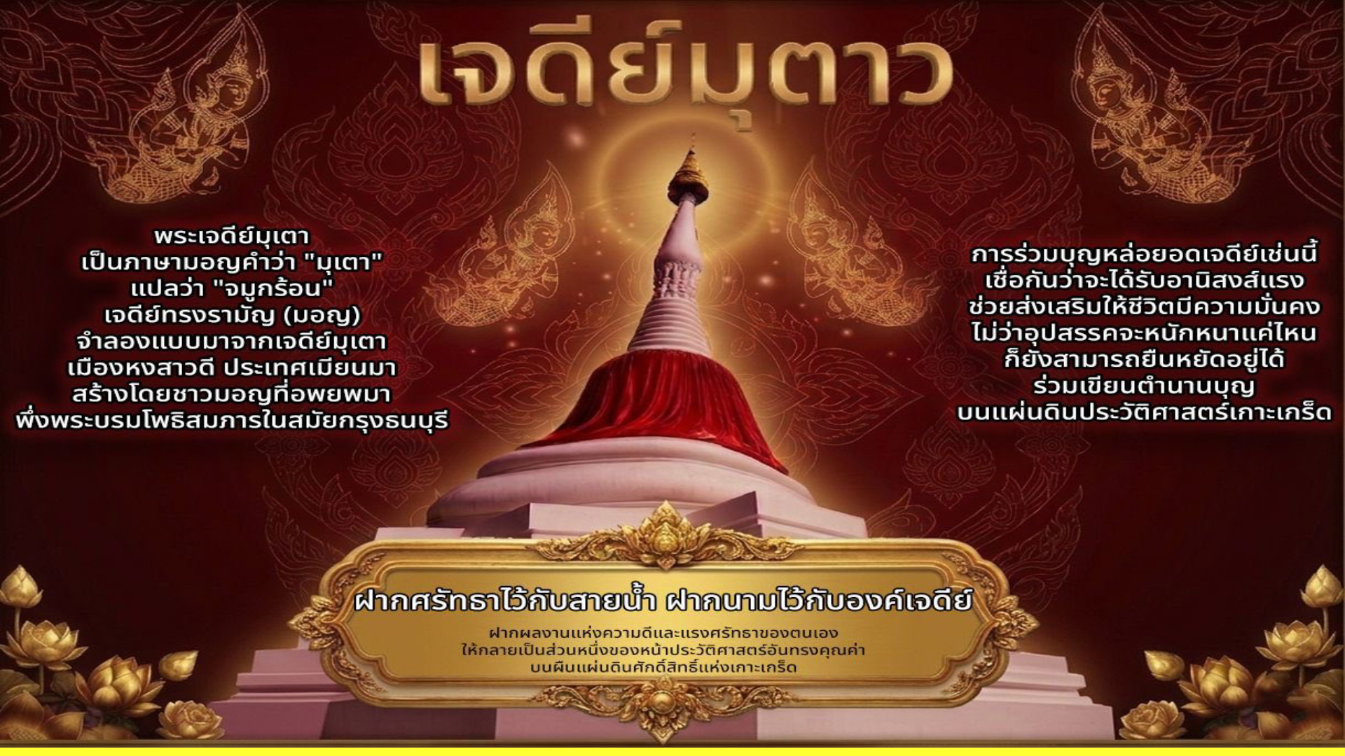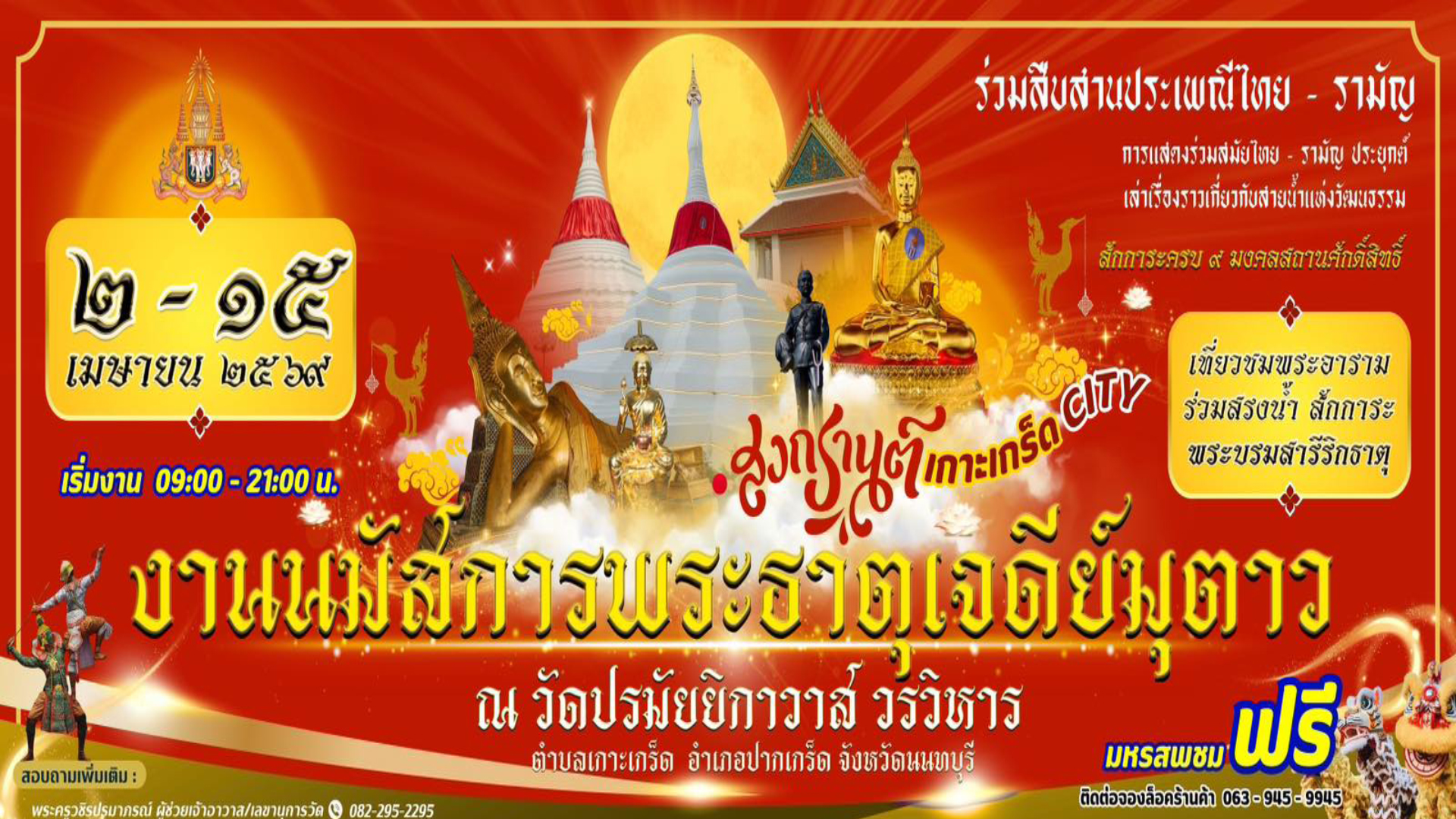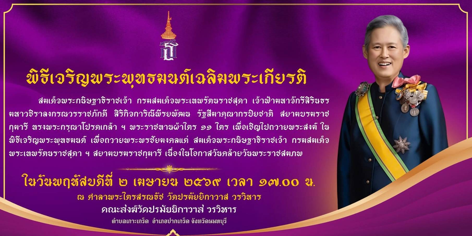 วันที่ 2 เมษายน 2569 เวลา 15.39 น. ณ วัดปรมัยยิกาวาส วรวิหาร ต.เกาะเกร็ด อ.ปากเกร็ด จ.นนทนบุรี พระเทพวชิรนันทาภรณ์ เจ้าคณะจังหวัดนนทบุรี เจ้าอาวาสวัดบัวขวัญ พระอารามหลวง เป็นประธานฝ่ายสงฆ์ นายสุทธิพงษ์ จุลเจริญ อดีตปลัดกระทรวงมหาดไทย เป็นประธานฝ่ายฆราวาส ในพิธีอัญเชิญผ้าไตรพระราชทานจำนวน 11 ไตร จากสมเด็จพระกนิษฐาธิราชเจ้า กรมสมเด็จพระเทพรัตนราชสุดา ฯ สยามบรมราชกุมารี ในการเจริญพระพุทธมนต์ถวายเป็นพระราชกุศล เนื่องในวันคล้ายวันพระราชสมภพ สมเด็จพระกนิษฐาธิราชเจ้า กรมสมเด็จพระเทพรัตนราชสุดา ฯ สยามบรมราชกุมารี และพิธีเปิดงานนมัสการพระธาตุเจดีย์มุเตา สืบสานประเพณีสงกรานต์มอญเกาะเกร็ด และเปิดโอกาสให้พุทธศาสนิกชนได้ทรงน้ำพระบรมสารีริกธาตุ ที่ได้รับพระราชทานจากพระบาทสมเด็จพระจุลจอมเเกล้าเจ้าอยู่หัว ทรงได้รับการทูลเกล้าฯ ถวายมาจากรัฐบาลอังกฤษซึ่งปกครองประเทศอินเดียในสมัยนั้น อันเป็นส่วนที่ค้นพบ ณ สถูปปิปราห์วา (Piprahwa) รัฐอุตรประเทศ โดยนายวิลเลียม แคลกซ์ตัน เปปเป ชาวอังกฤษ เมื่อปี พ.ศ. 2441 ซึ่งงานนมัสการพระธาตุมุเตา ทรงน้ำพระบรมสารีริกธาตุ และ สืบสานประเพณีสงกรานต์มอญเกาะเกร็ด จัดกิจกรรรมระหว่างวันที่ 2 – 15 เมษายน 2569