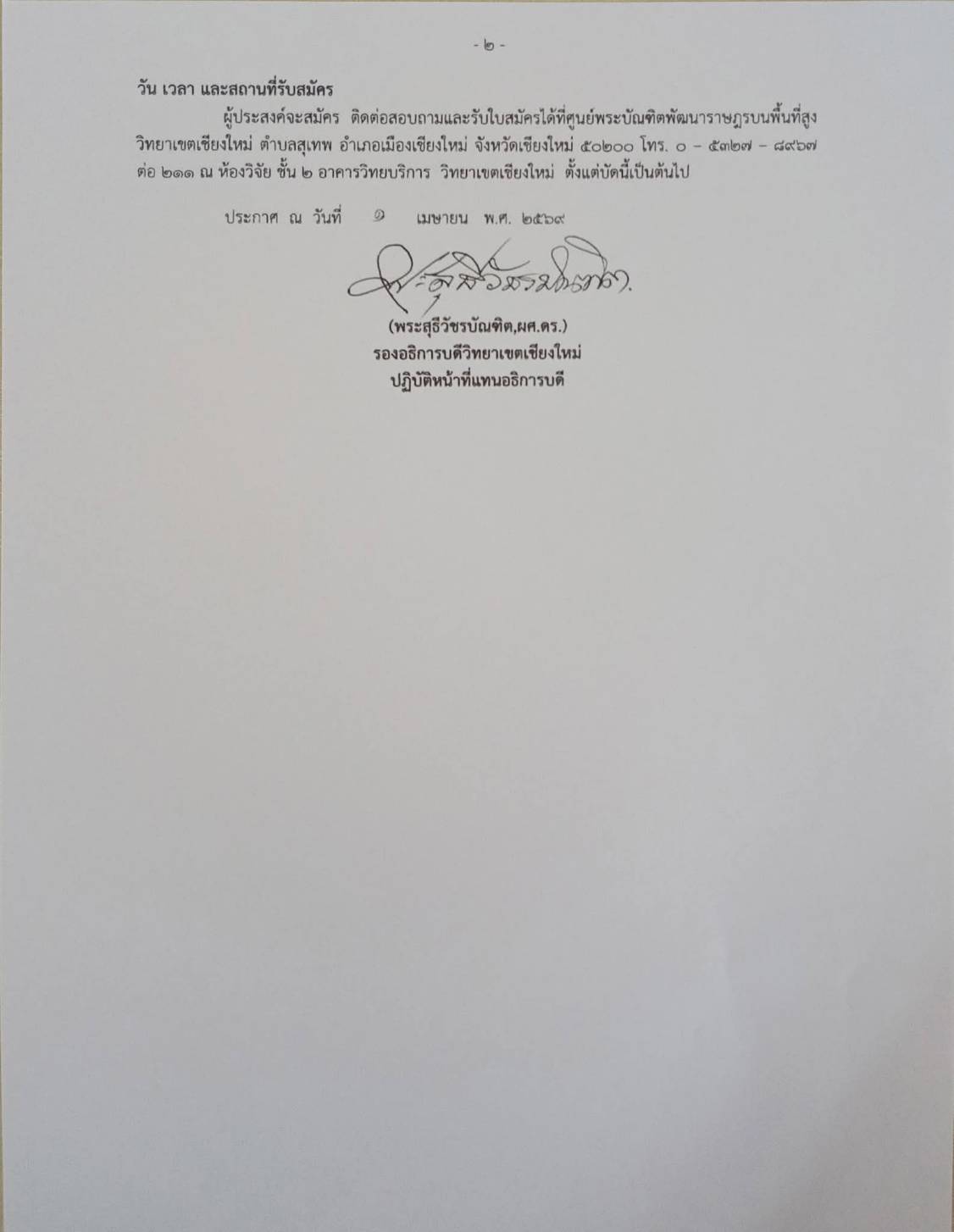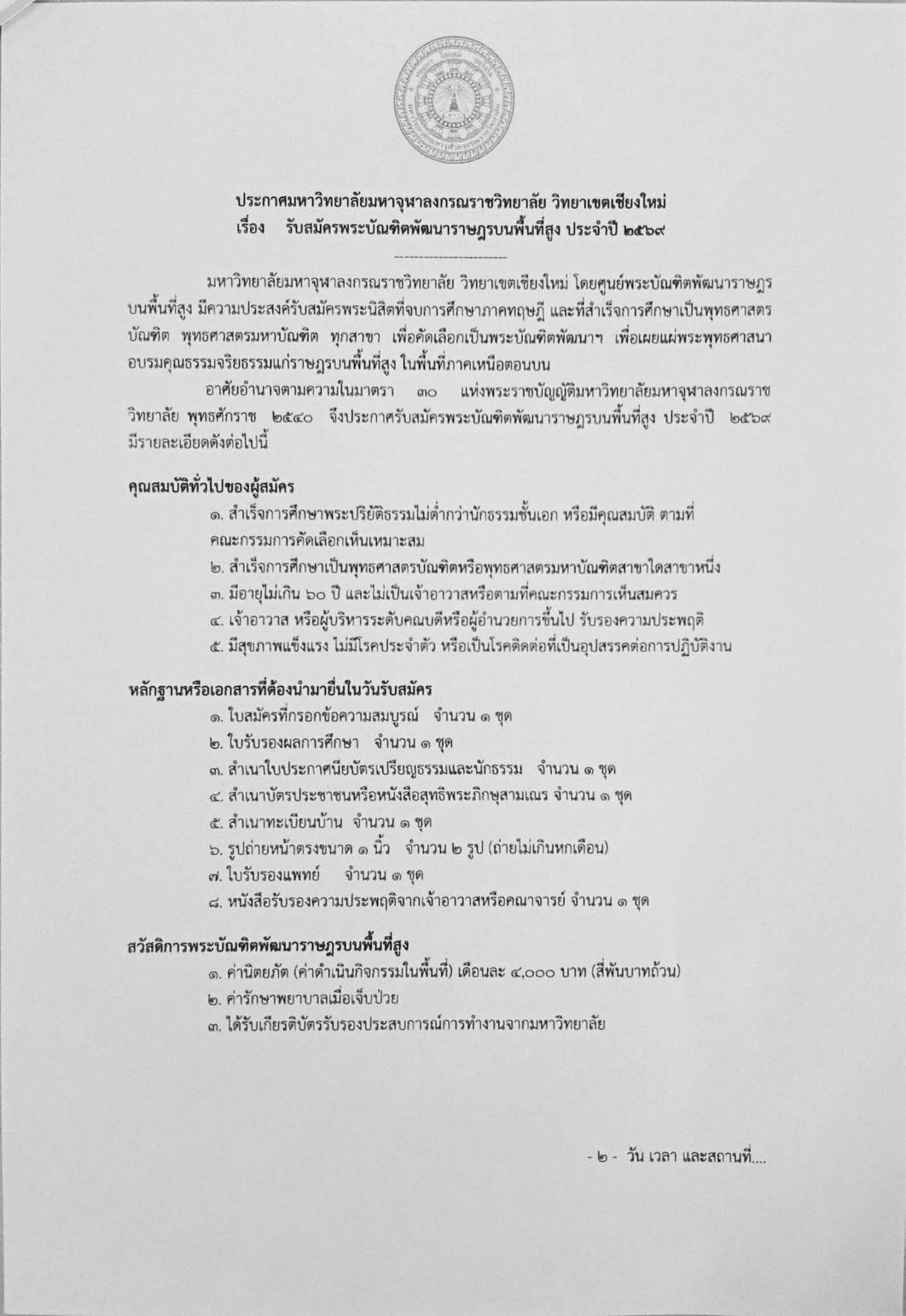 วันที่ 8 เมษายน 2569 เมื่อต้นเดือนที่ผ่านมา พระสุธีวัชรบัณฑิต รองอธิการบดีวิทยาเขตเชียงใหม่ ได้ลงนามประกาศมหาวิทยาลัยมหาจุฬาลงกรณราชวิทยาลัย วิทยาเขตเชียงใหม่ เรื่อง การรับสมัครพระบัณฑิตพัฒนาราษฎรบนพื้นที่สูง ประจำปี 2569 พร้อมกับกำหนดคุณสมบัติทั่วไป อายุไม่เกิน 60 ปี มีสุขภาพแข็งแรง รับนิตยภัตเดือนละ 4,000 พันบาท พร้อมดูแลยามป่วย!!