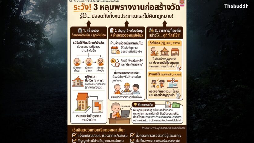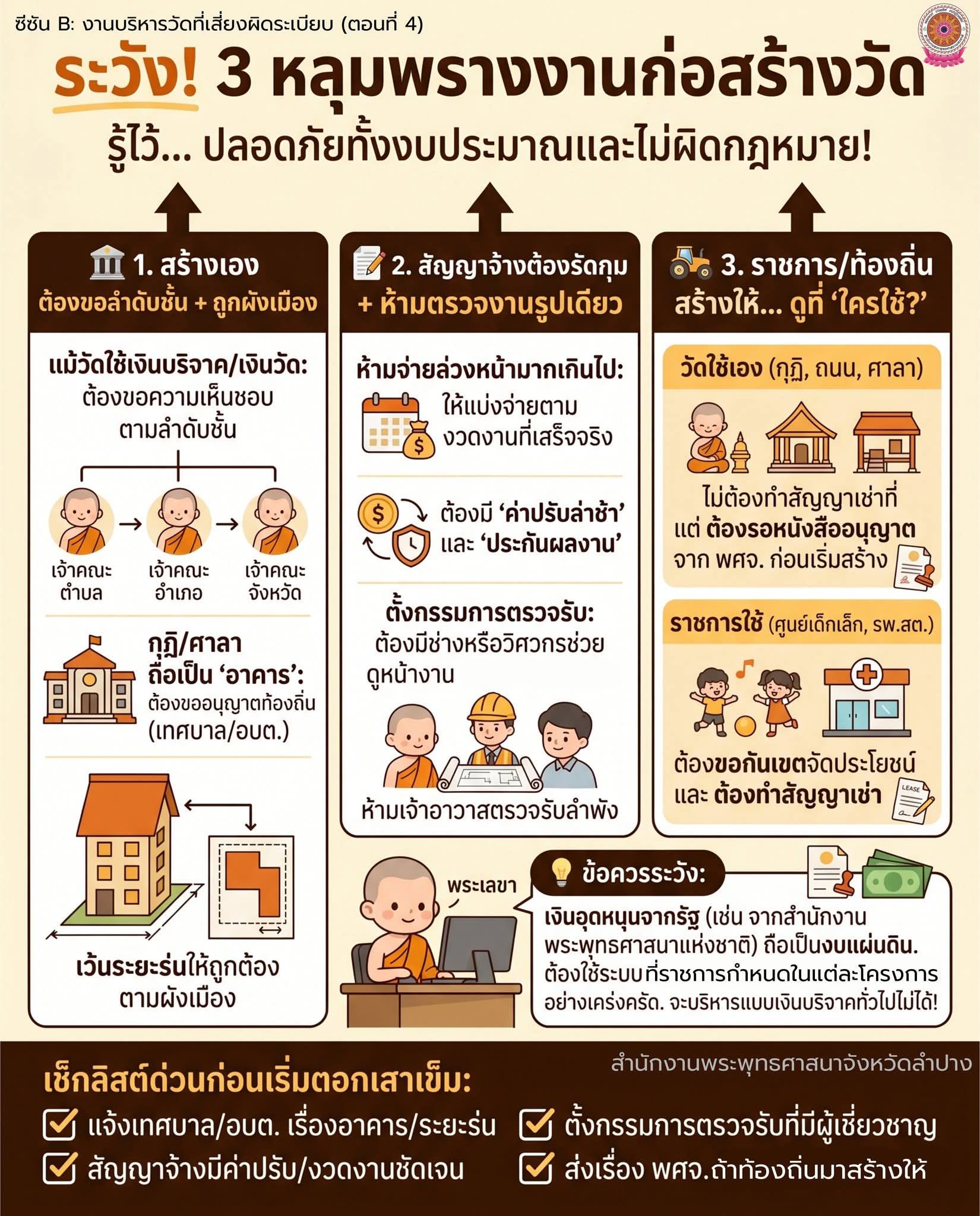 ในรอบปีหนึ่ง ๆ วัดวาอารามทั่วประเทศมีการก่อสร้างและบูรณปฏิสังขรณ์เสนาสนะเป็นจำนวนมาก แต่มักมีปัญหาจุกจิกและเสี่ยงต่อการถูกร้องเรียนสำหรับพระสังฆาธิการมากที่สุด คือ “ปัญหาผู้รับเหมาทิ้งงาน” “การก่อสร้างผิดแบบจนผิดกฎหมายผังเมือง” หรือแม้แต่ “ความเข้าใจผิดเมื่อราชการส่วนท้องถิ่นจะเข้ามาก่อสร้างสิ่งอำนวยความสะดวกในวัด” หลายกรณีเกิดจากการละเลยขั้นตอนการขออนุญาต การทำสัญญาจ้างที่หละหลวม หรือการไม่มีระบบตรวจรับงานที่รัดกุมเพียงพอ ดังนั้น การเรียนรู้วิธีบริหารโครงการก่อสร้างอย่างถูกต้องตามระเบียบ จึงเป็นการปกป้องทั้ง “งบประมาณของวัด” และ “สถานภาพของพระสังฆาธิการ” ให้ปลอดภัยจากข้อครหาทางกฎหมาย