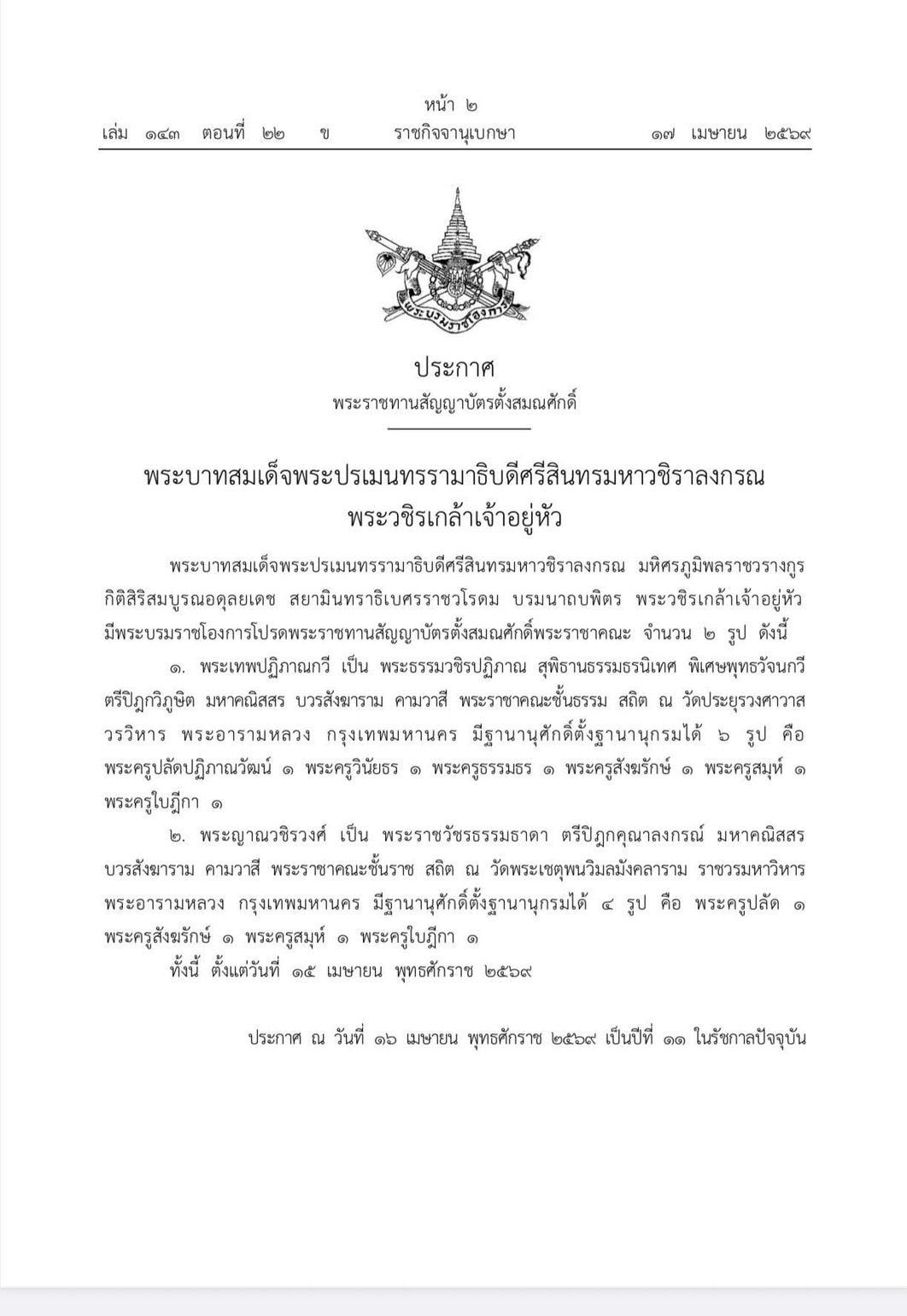 วันที่ 17 เมษายน 2569 พระบาทสมเด็จพระปรเมนทรรามาธิบดีศรีสินทรมหาวชิราลงกรณ พระวชิรเกล้าเจ้าอยู่หัว ทรงมีพระบรมราชโองการโปรดเกล้าสมณศักดิ์จำนวน 2 รูป ดังนี้