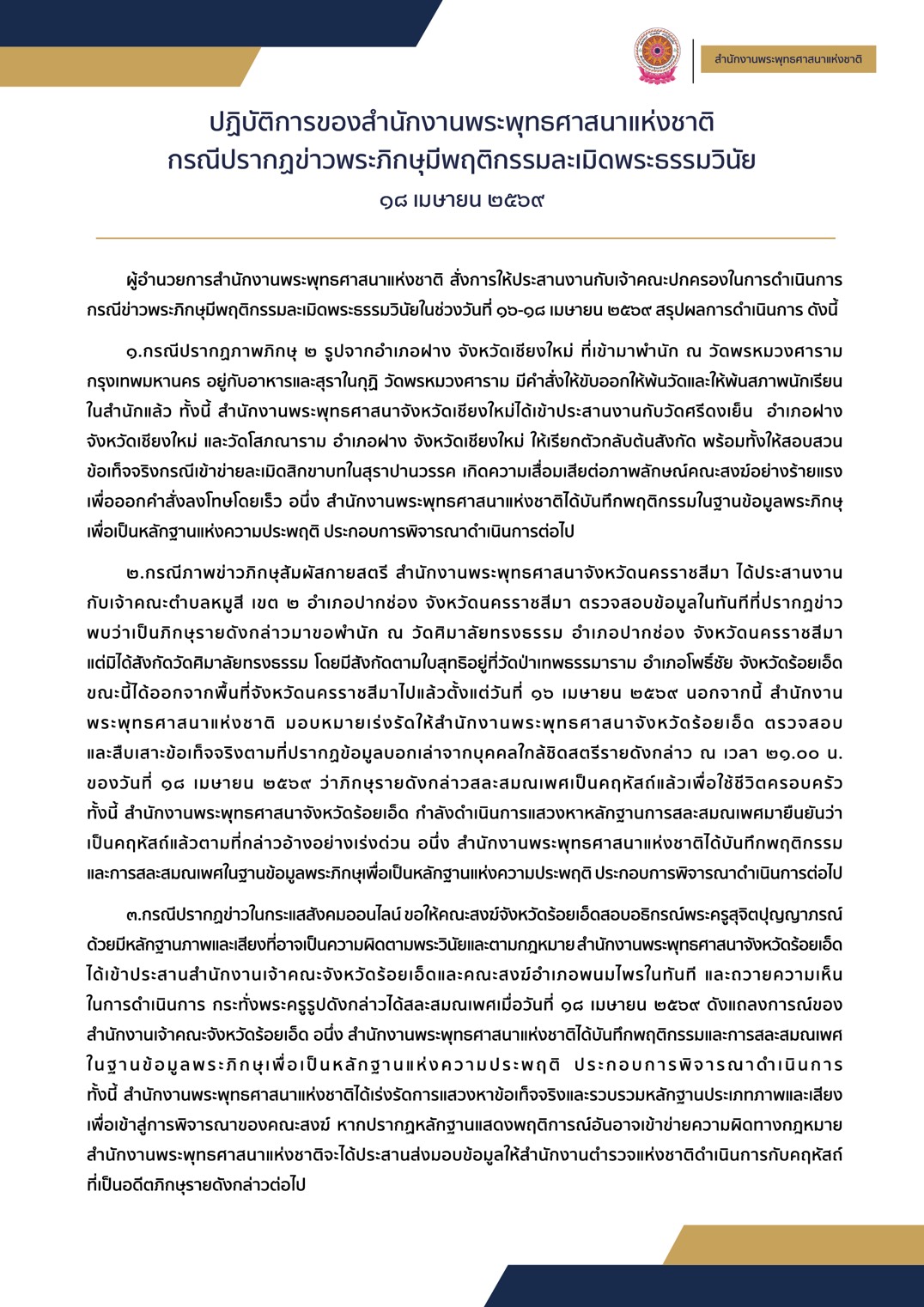 วันที่ 19 เมษายน 2569 สำนักงานพระพุทธศาสนาแห่งชาติ แจ้งข่าวกรณีปรากฏข่าวพระภิกษุมีพฤติกรรมละเมิดพระธรรมวินัยในช่วงวันที่ 16-18 เมษายน 2569 สรุปผลการดำเนินการ ดังนี้