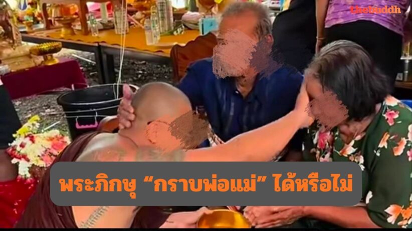 และล่าสุดมีการแชร์ภาพภาพพระภิกษุรูปหนึ่ง กำลังคุกเข่ารดน้ำที่เท้าที่คาดว่าเป็นพ่อและแม่ที่นั่งอยู่บนเก้าอี้ แล้วมาลูบหัวตนเอง ขณะที่บุคคลทั้งสองในภาพกลับลูบหัวของพระภิกษุ ในประเด็นดังกล่าว แม้ในภาพจะไม่ปรากฎว่ามีการกราบเท้า แต่ก็ถูกตั้งคำถามถึงเหมาะสมหรือไม่ เนื่องจากการเป็นพระภิกษุในพระพุทธศาสนาถือว่าสละเรือนออกบวช และได้รับฉายาหรือชื่อใหม่ ซึ่งตามความเชื่อของโบราณกาลเป็นคนใหม่แล้ว